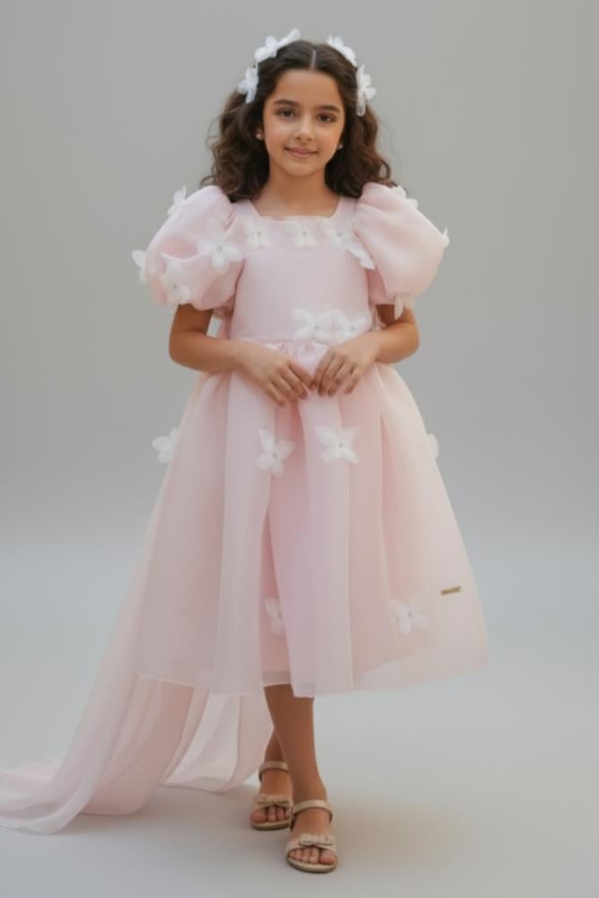 فستان بناتي أبيض أنيق بتطريز ناعم وأكمام تولS01262