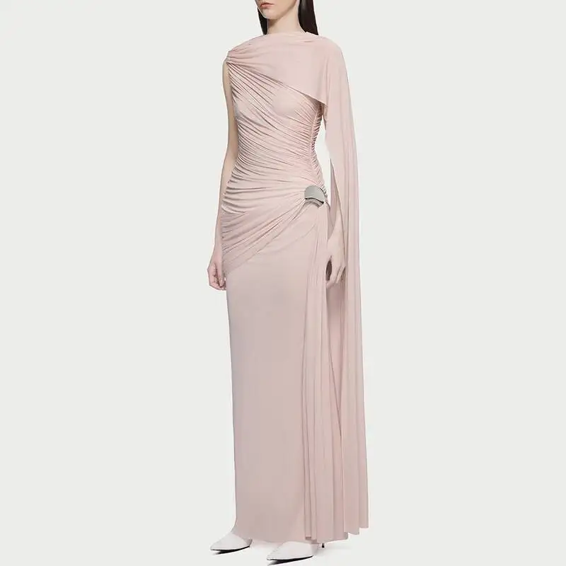 فستان نسائي ضيق غير متماثل بلون سادة مكشكش بدون أكمام شال تصميم فساتين 2025 ملابس جديدة