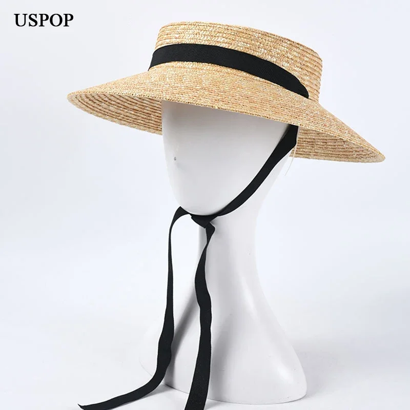 USPOP جديد النمط الفرنسي خمر الضحلة تاج القش القبعات النساء القش قبعات للحماية من الشمس الشريط الطويل القمح الطبيعي القش قبعة للشاطئ