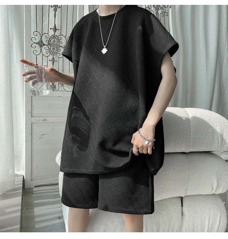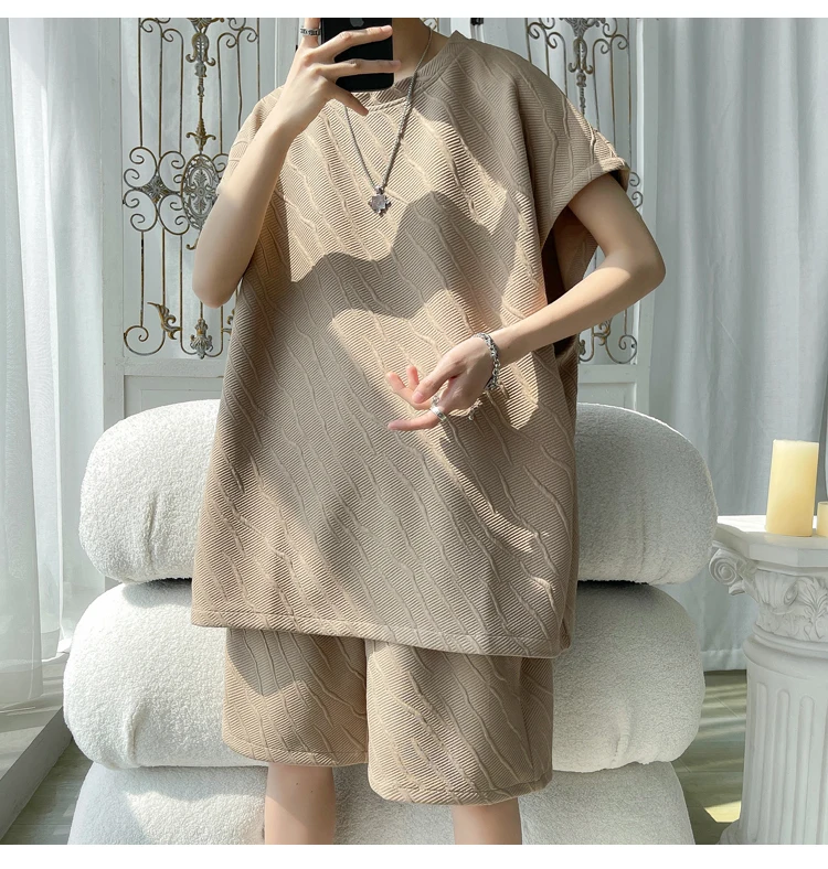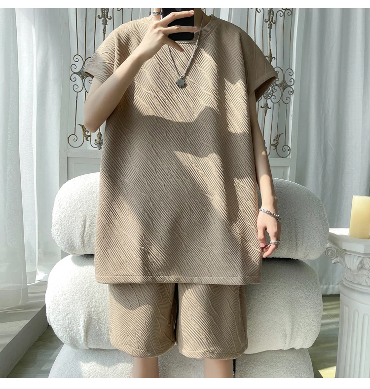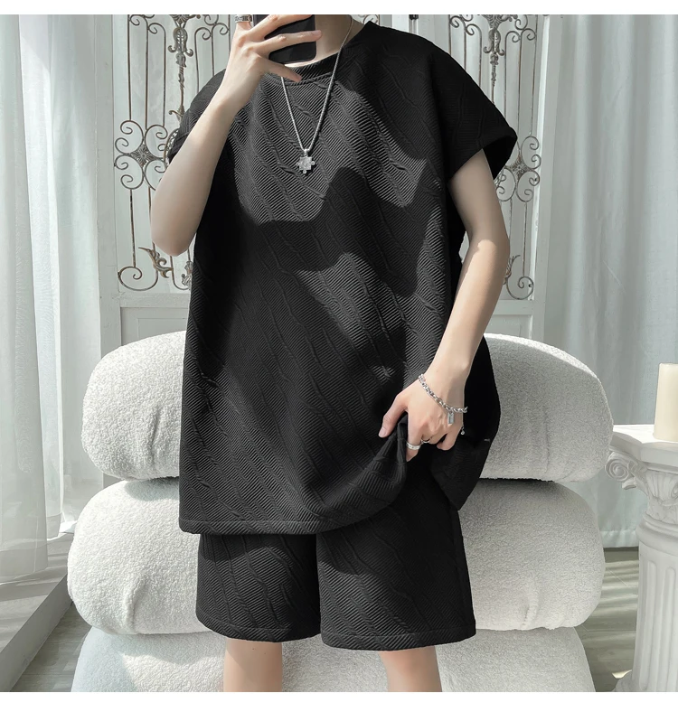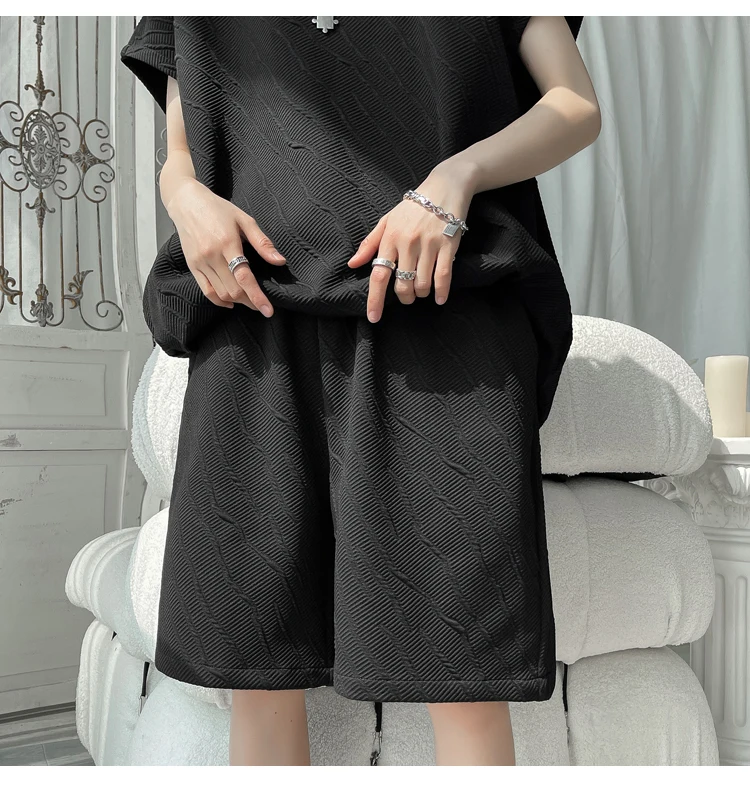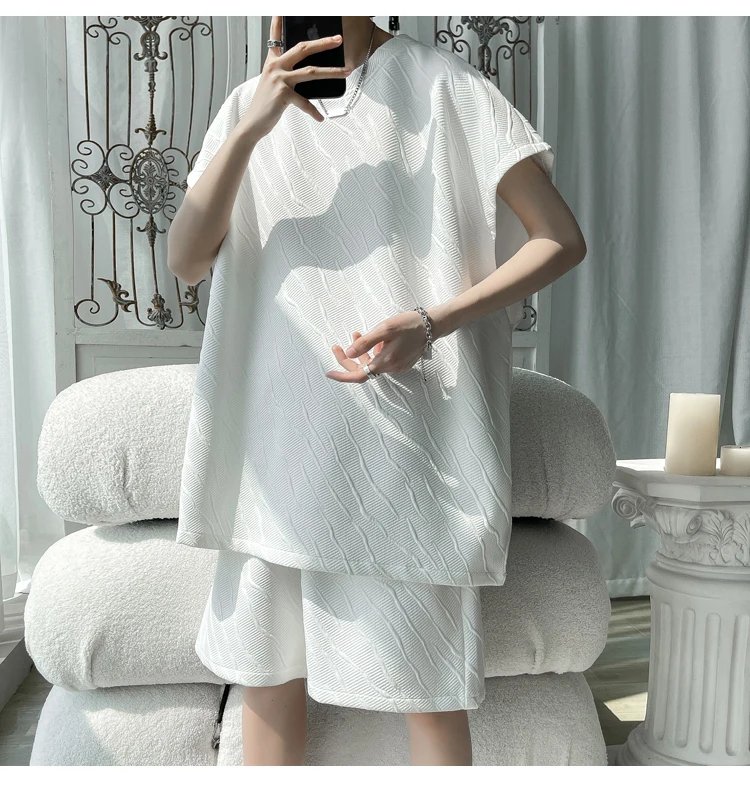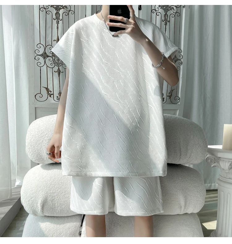 - أطقم تي شيرت وسراويل جاكار كاجوال فضفاض للرجال ، جودة عالية ، ملابس كورية فاخرة ، مقاس كبير 5 × لتر ، موضة صيفية