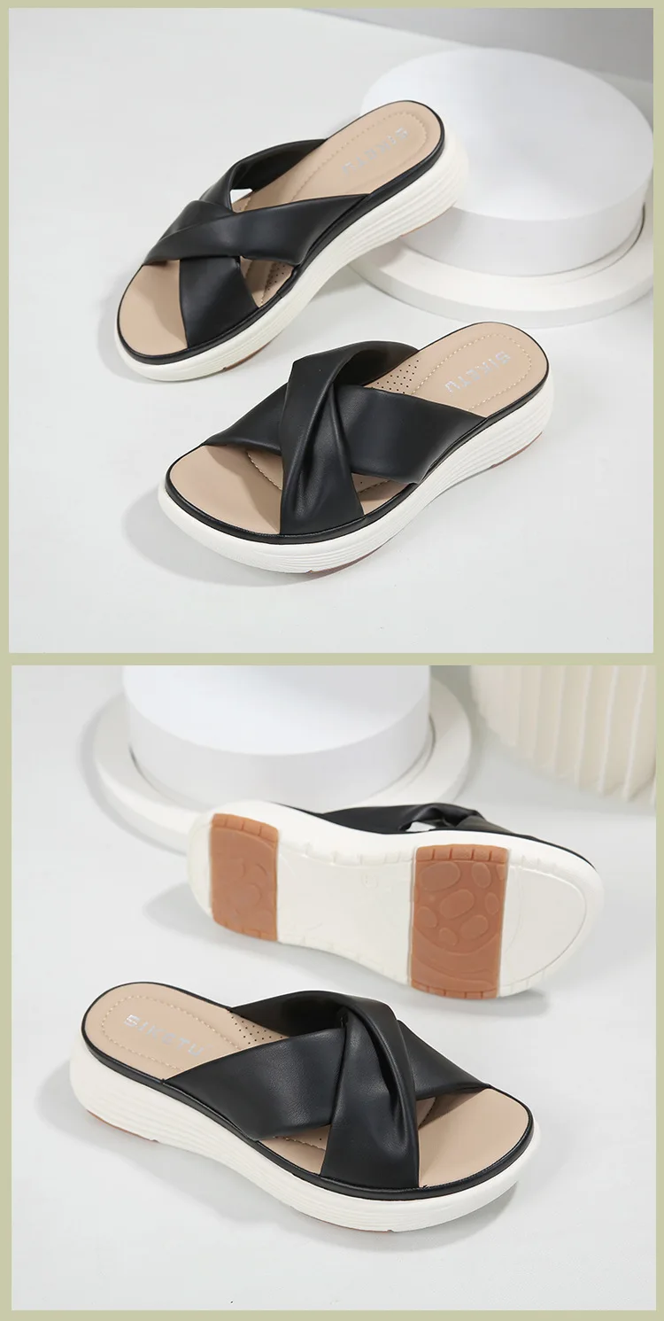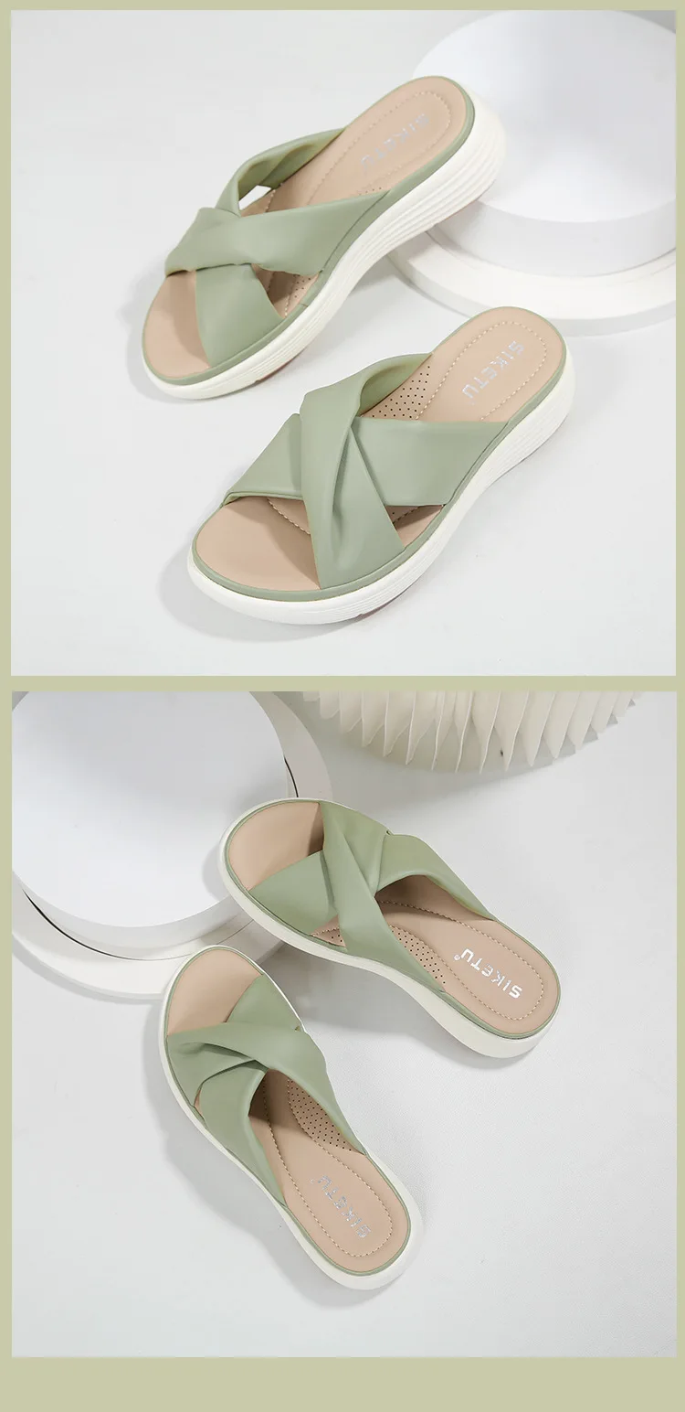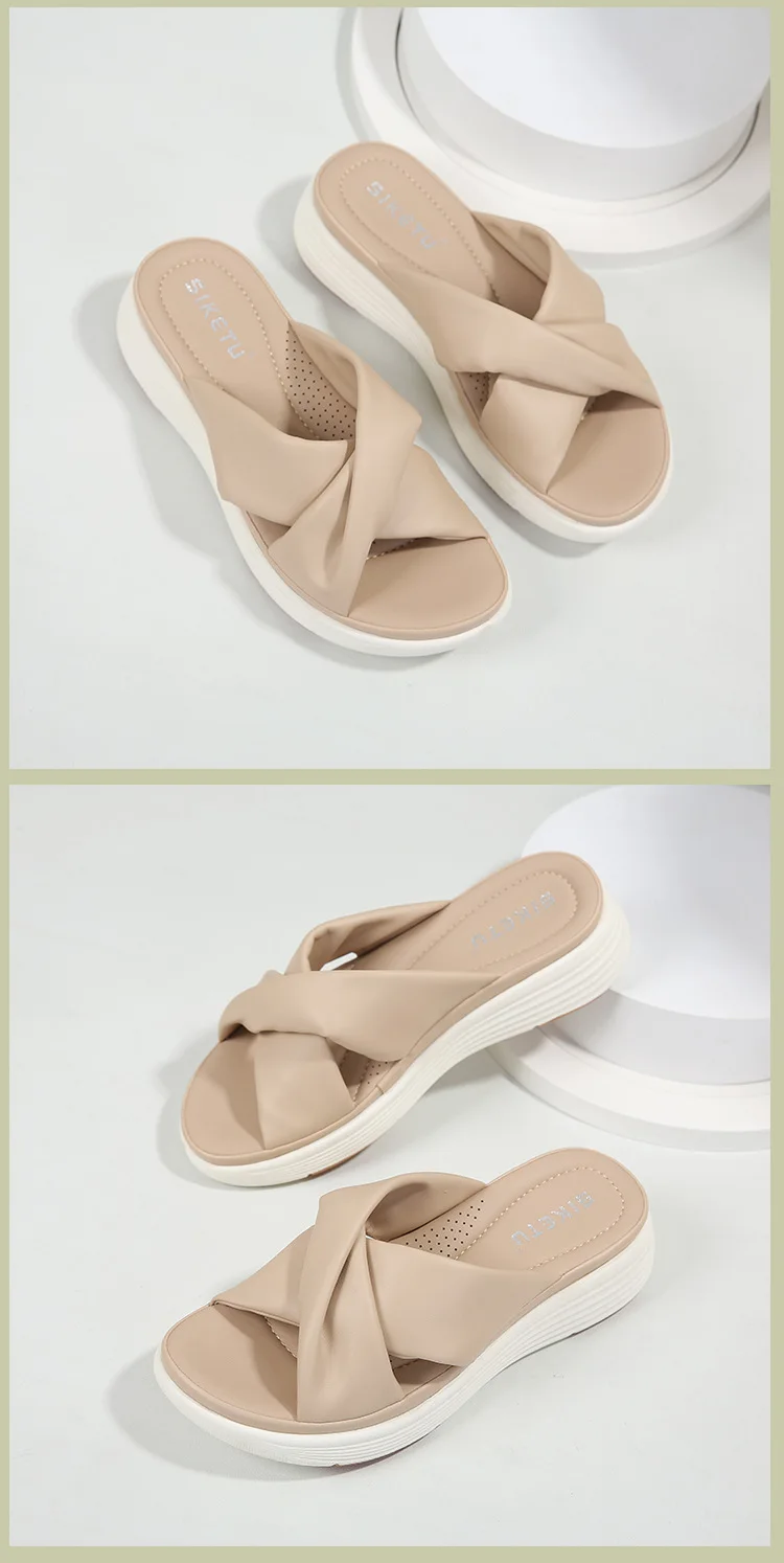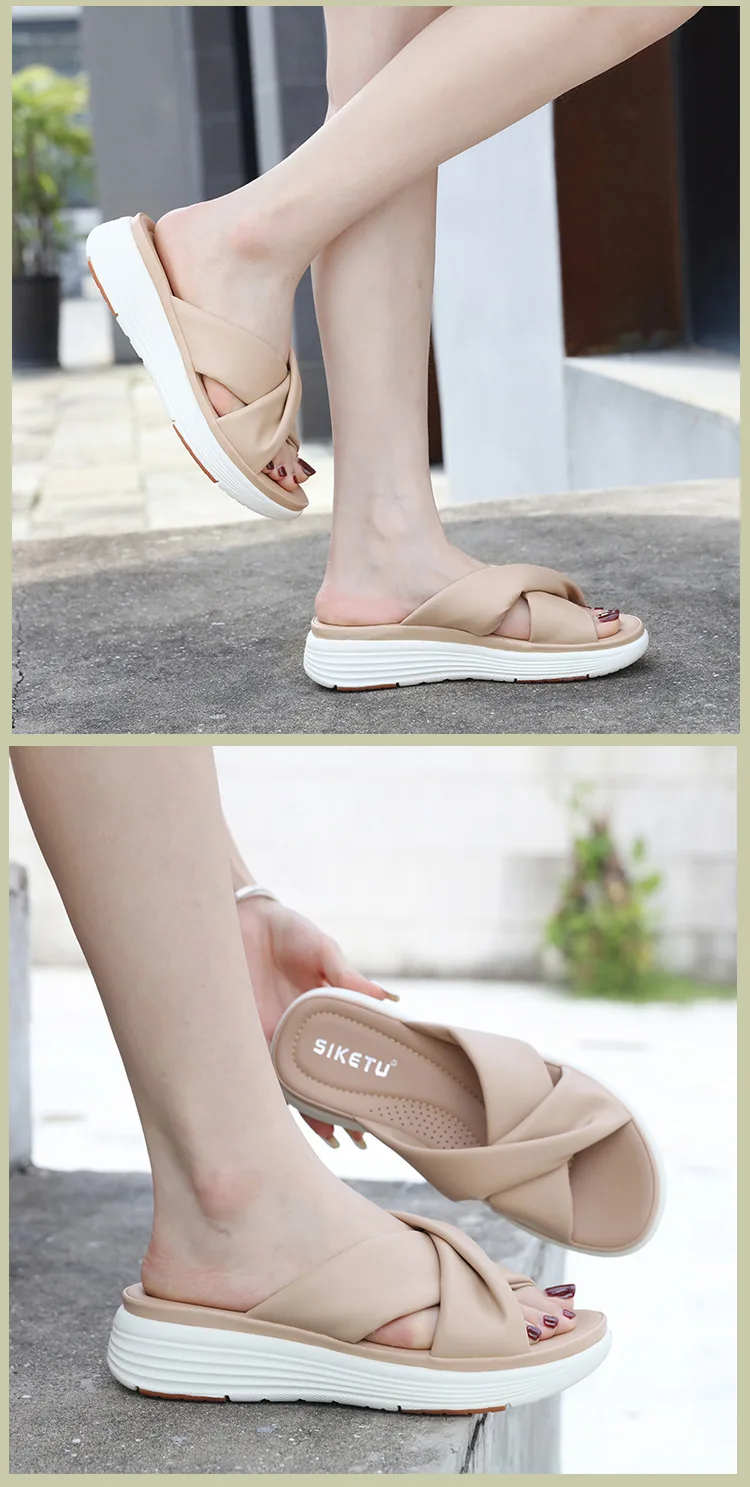 - SIKETU ماركة عادية إسفين مطوي الصليب أشرطة سميكة الشرائح النساء بلون فستان كلاسيكي الانزلاق على النعال المشي ضوء الصيف