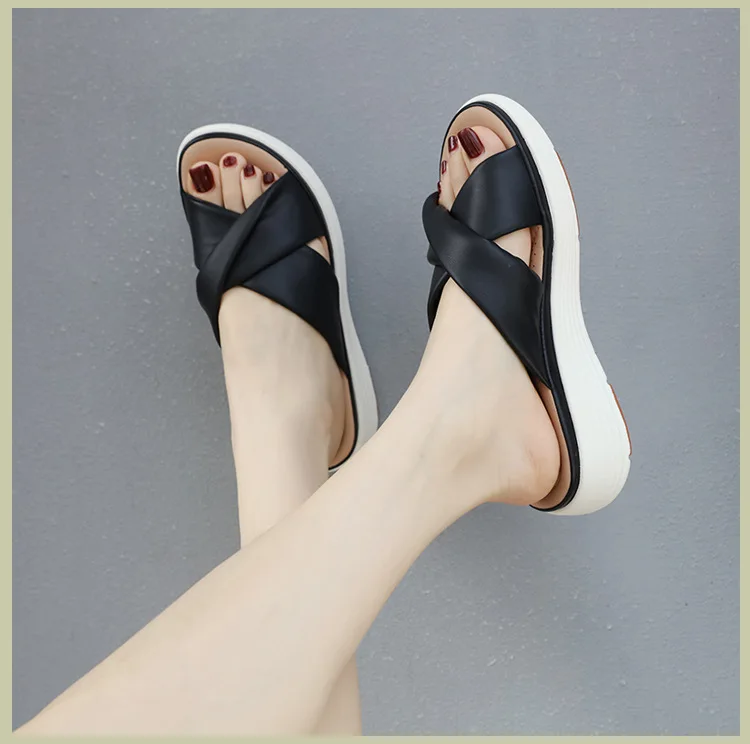 SIKETU ماركة عادية إسفين مطوي الصليب أشرطة سميكة الشرائح النساء بلون فستان كلاسيكي الانزلاق على النعال المشي ضوء الصيف