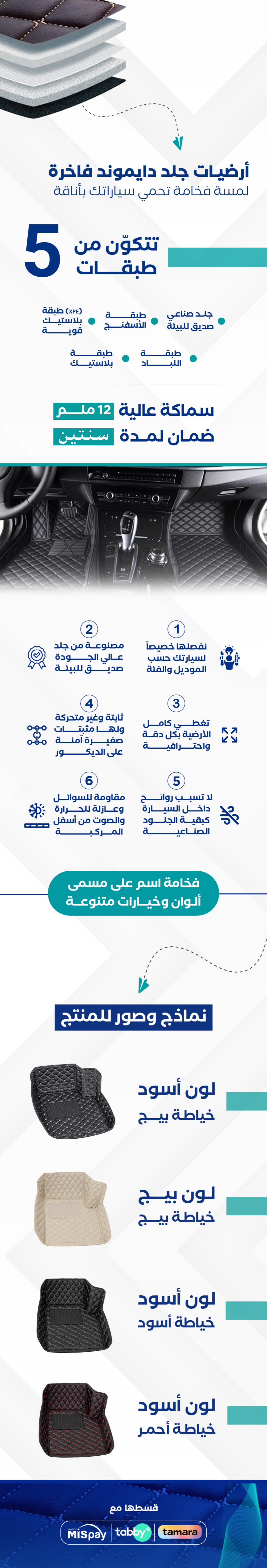 أرضيات سيارات جلد فاخر VIP متوفرة لجميع السيارات من بصمة لامعة مع الضمان سنتين بالإضافة إلى توصيل سريع.
