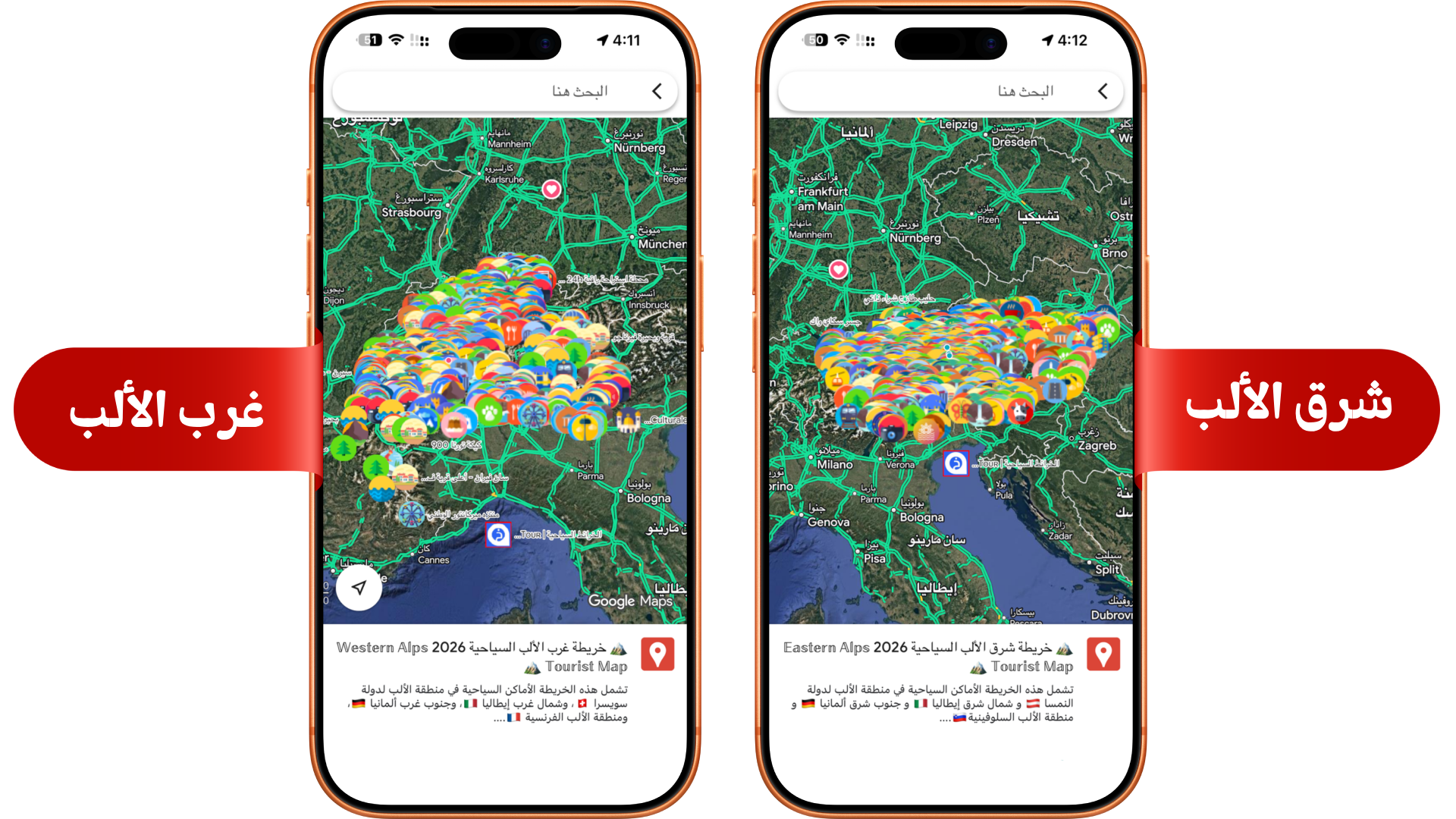 💡مثال: إذا كان مسار رحلتك من النمسا ويمر بالجنوب الالماني والشمال الايطالي القريب من النمسا فأنت لا تحتاج إلى فتح خرائط أخرى لإكتشاف الأماكن السياحية (خريطة شرق الألب السياحية تُغنيك👍).