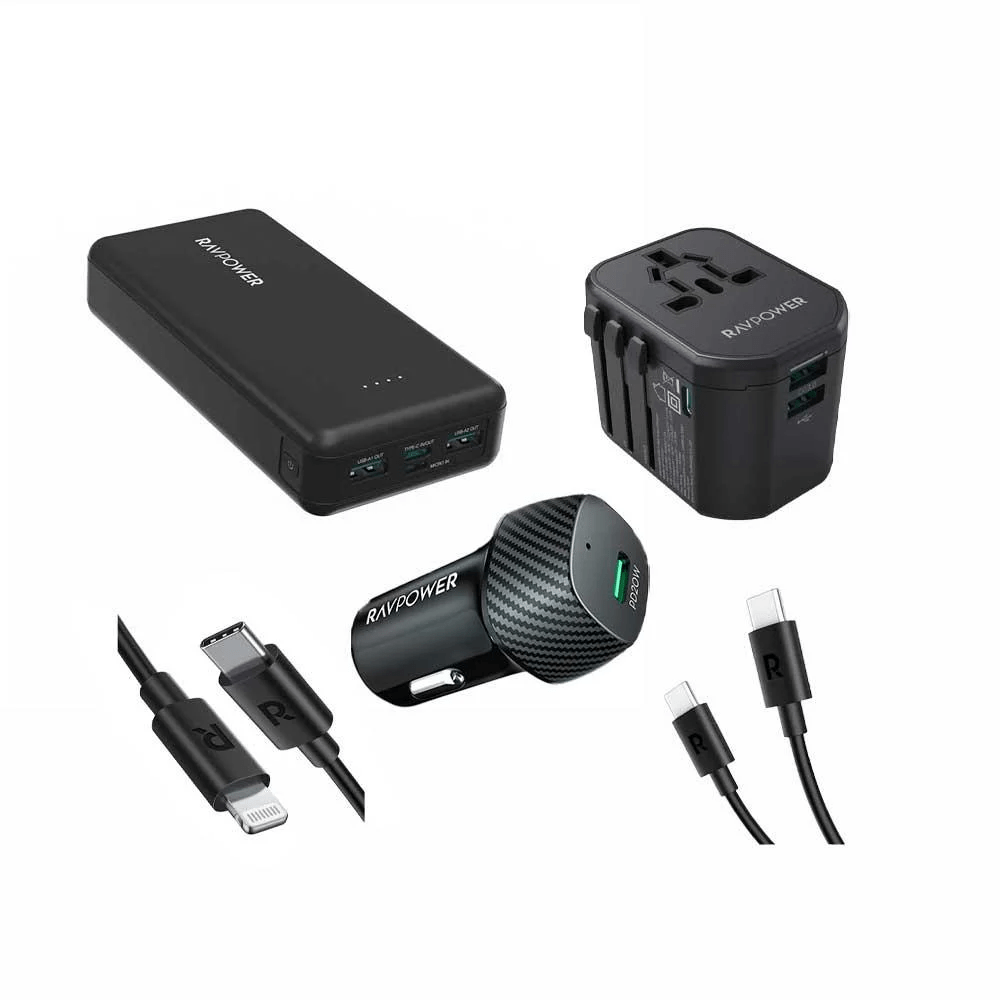 بكج السفر راف باور بطارية 20000 ملي امبير + فيش سفر + شاحن سياره + سلك تايب سي الى لايتنينق + سلك تايب سي الى تايب سي