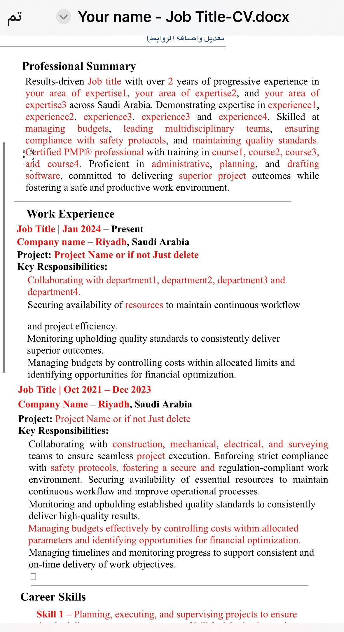 هذا القالب ليس سيرة ذاتية جاهزة، بل ملف منسّق بالكامل يحتوي على أماكن مخصصة لإضافة معلوماتك الشخصية بشكل صحيح، مع إبراز جميع الخانات التي تحتاج تعديلها باللون الأحمر لتسهيل التحرير.