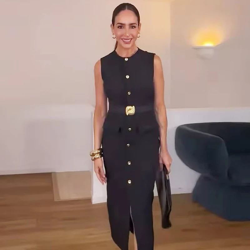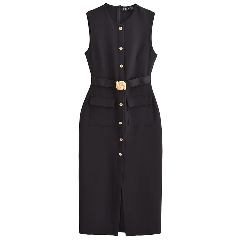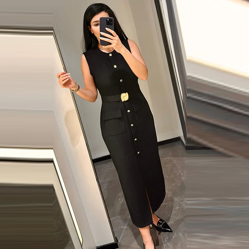 فستان نسائي أسود أنيق من TRAF، طويل بحزام، بدون أكمام، تصميم ضيق مع أزرار، مناسب للصيف للطلعات غير الرسمية. فساتين نسائية سوداء من TRAF فساتين طويلة بحزام لصيف 2025 فساتين نسائية غير رسمية ميدي بدون أكمام فساتين ضيقة بأزرار