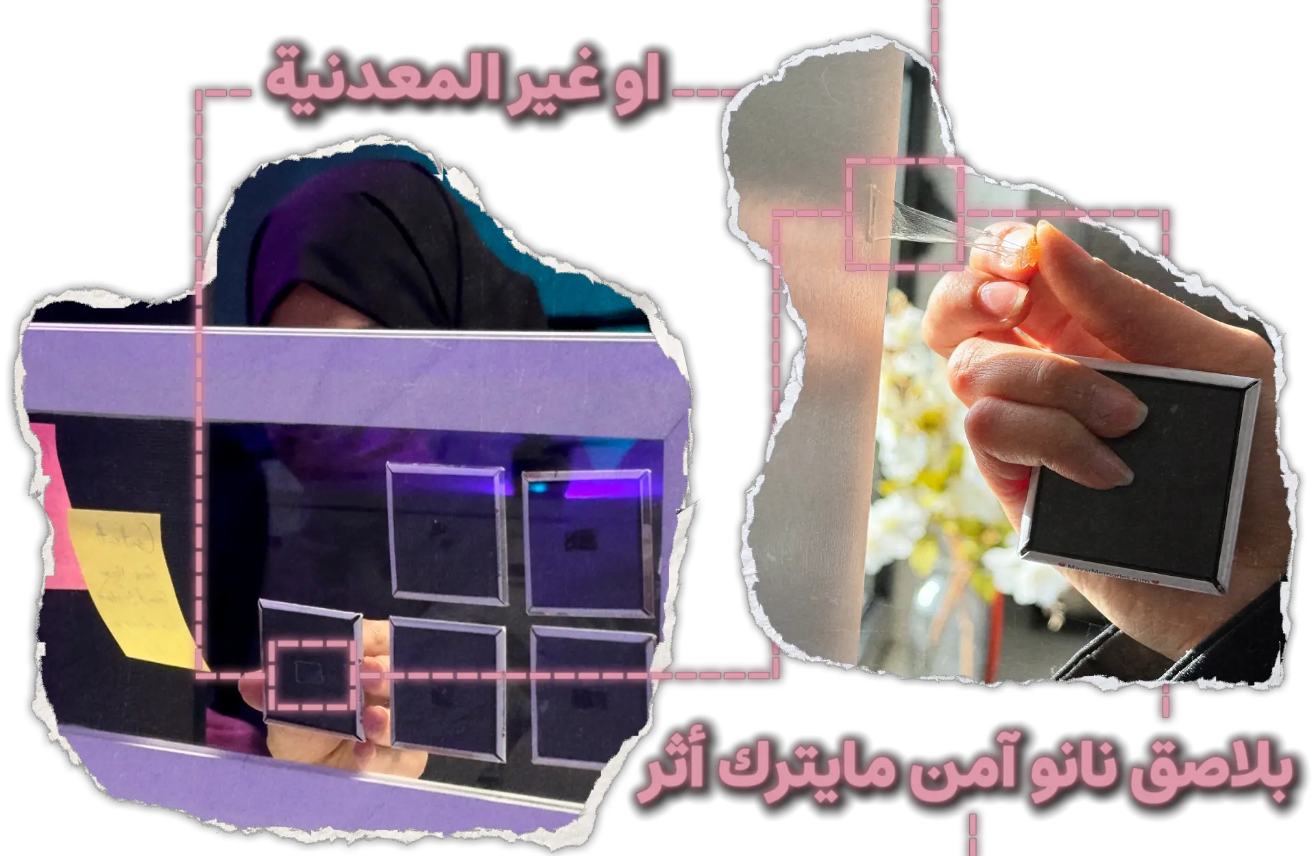 جـــ✅: أبد! تقنية اللاصق آمنة جداً وتقدرين تشيلينها وتغيرين مكانها بدون أي أثر أو تقشير.
