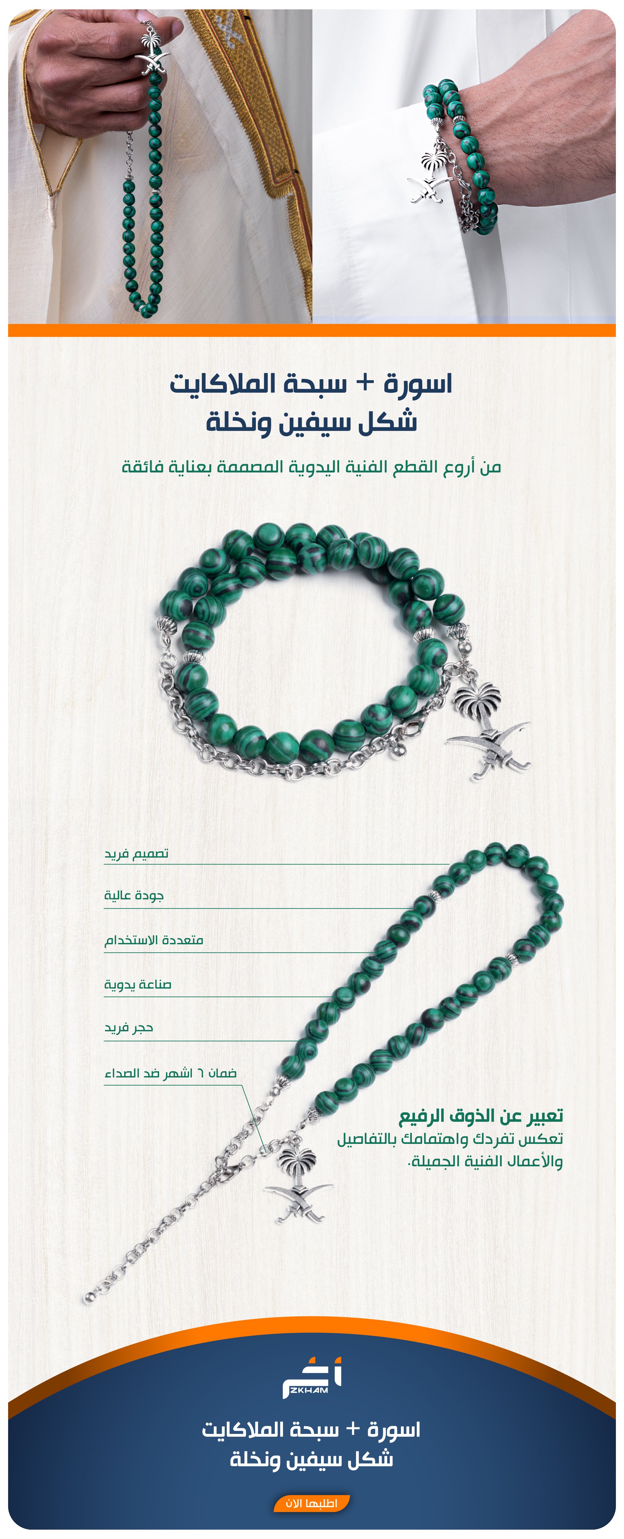 تعد سبحة (الملاكايت) بشكل سيفين ونخلة و إسورة من أروع القطع الفنية اليدوية المصممة بعناية فائقة، حيث تجمع بين روعة التصميم والأناقة الساحرة. يتم تصنيعها بعناية يدوياً باستخدام أجود الأحجار الكريمة والمواد الفاخرة، مما يضفي عليها مظهرًا ساحرًا وفريدًا. و يجعلها تحتفظ بجاذبيتها ولمعانها لفترة طويلة.