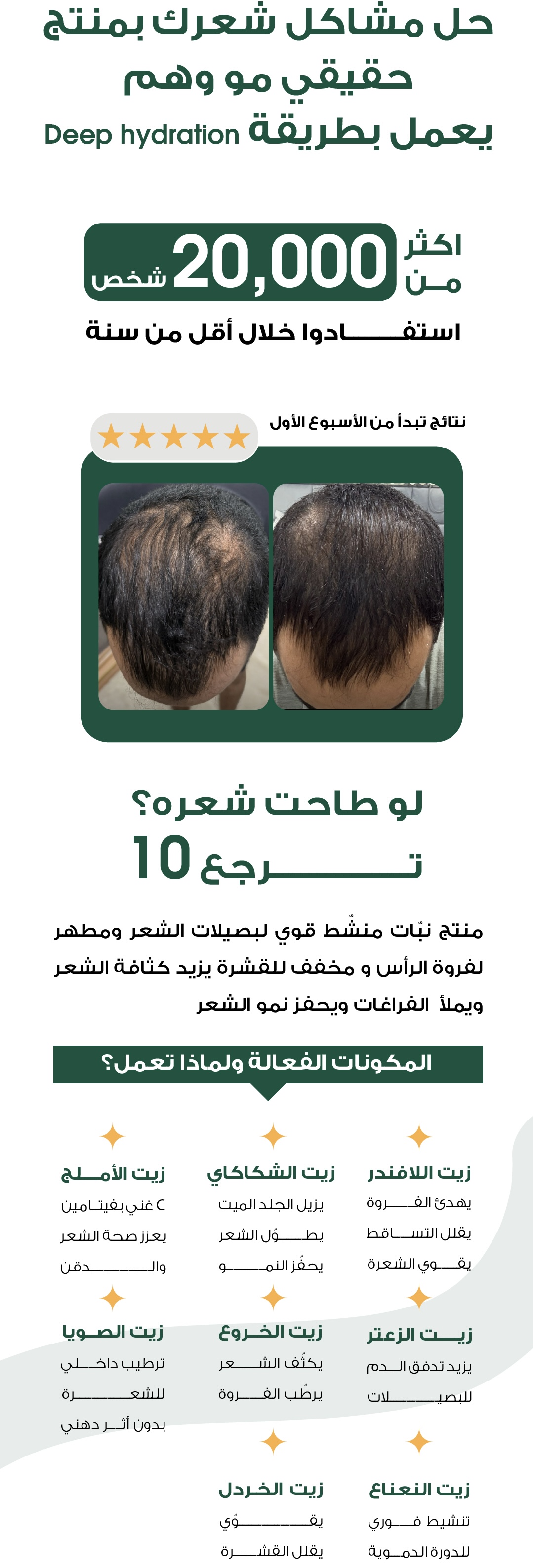 1. 100% طبيعي ونقي: مستخلص من زيوت نباتية غنية بالعناصر المغذية لشعرك.