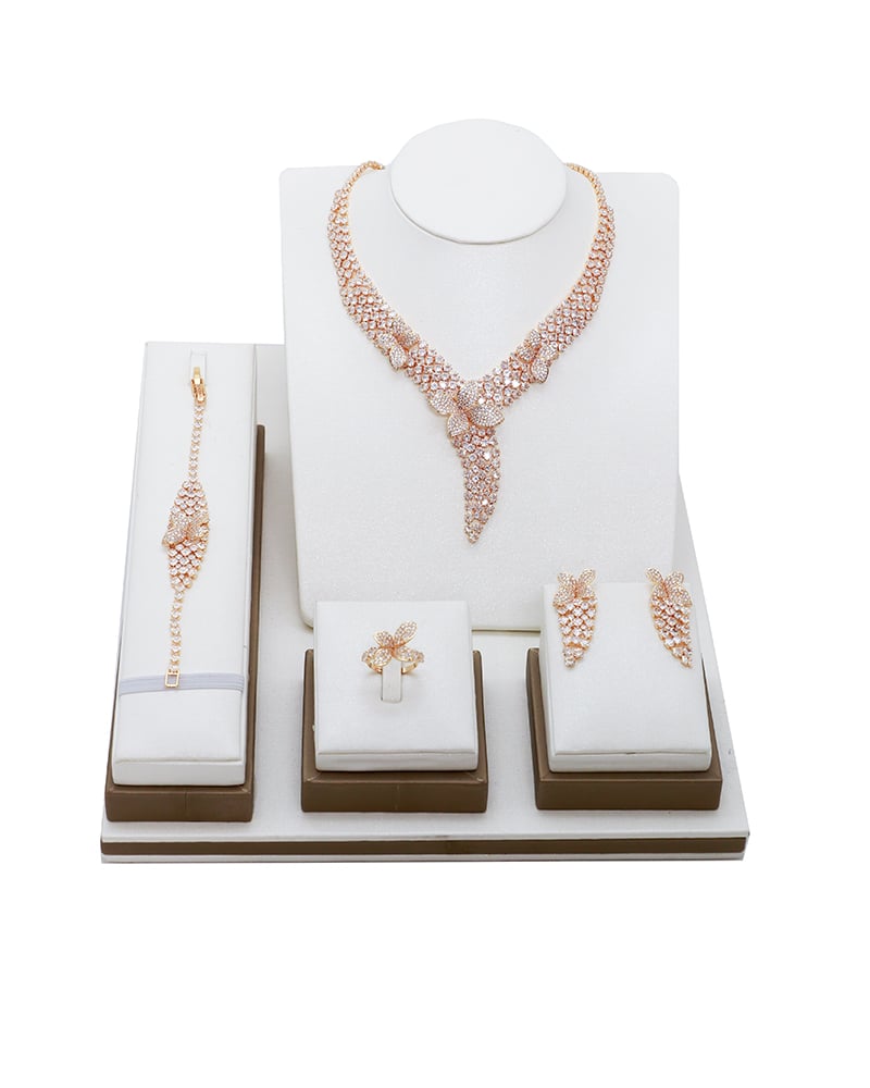 · مكونات الطقم: عقد رقبة عريض، سوار ناعم، خاتم بتصميم وردة، وأقراط متدلية