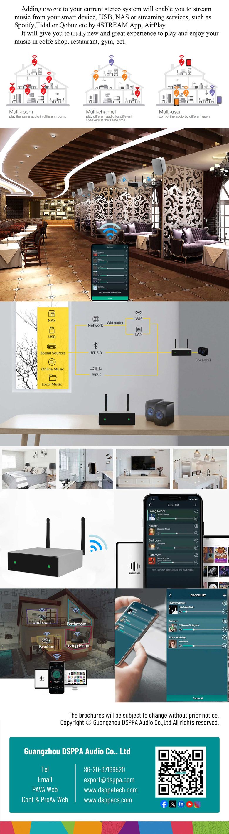 مع التطور المستمر للتكنولوجيا، تشهد تقنية نقل الصوت اللاسلكي WiFi تحسنًا سريعًا. نظرًا لمرونته، وعدم الحاجة إلى الأسلاك وقابلية التوسع والتنقل وغيرها من المزايا، فقد تم استخدامه على نطاق واسع في السوق. يعتبر المستخدم نظام الموسيقى الخلفية أكثر اهتمامًا بالموسيقى المخصصة، مع مصادر برامج متعددة ومناطق متعددة، والتحكم واختيار موسيقى المنطقة لسيناريوهات مختلفة، بدلاً من الصوت فقط. على سبيل المثال، في المنزل والمقاهي والمطاعم وصالات الألعاب الرياضية وغيرها من الأماكن، باستخدام تقنية نقل الصوت اللاسلكي WiFi، سوف تحصل على تجربة جديدة وتستمتع بالموسيقى.