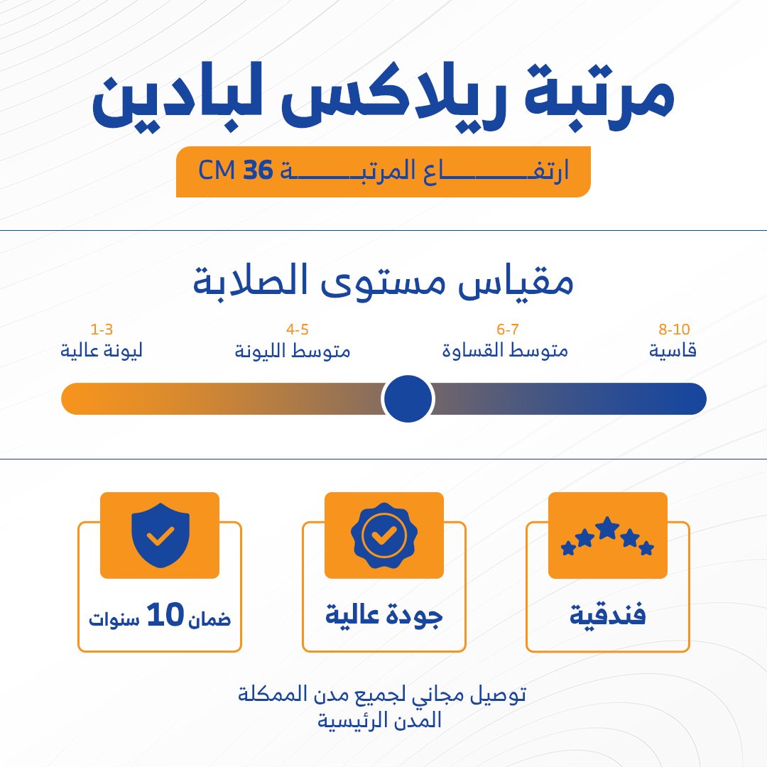 مرتبة ريلاكس تُشعرك بالنوم العميق و الاسترخاء، تمتاز بطبقات من الأسفنج متوسط القساوة وتحتوي على لبادين مما يساعد على إعطاء المرتبة راحة أثناء النوم مع توفرالدعم الكامل للجسم من خلال قاعدة نوابض بجودة عالية لتمنح إحساس النشاط والحيوية عند الاستيقاظ