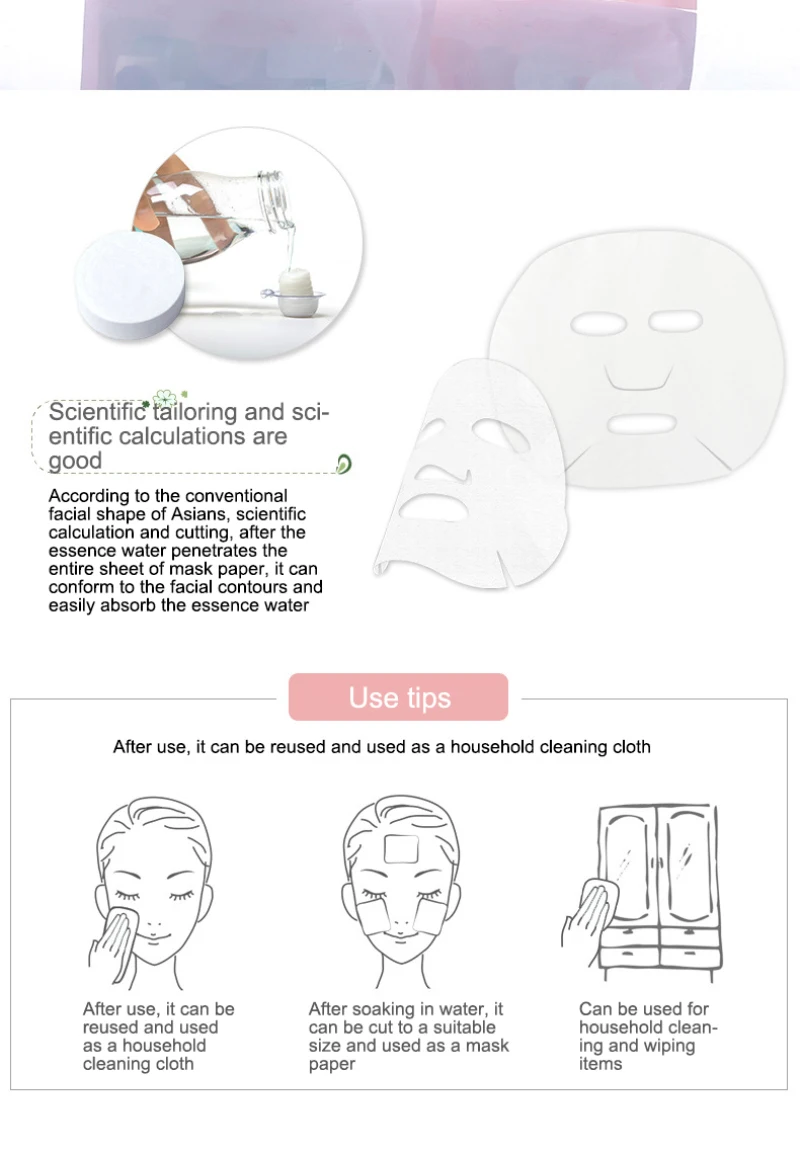 أقنعة الجمال عالية الجودة ، والمعروفة أيضًا باسم قناع القطن غير المنسوج القابل للتصرف عالي الجودة. استخدام المواد الطبيعية النباتية النقية ، بدون مكونات كيميائية ، بيضاء وناعمة ، لا تؤذي الجلد ، ضع المكياج/المزيل ، تنظيف الوجه ، للاستخدام مرة واحدة ، خالية من الحطام ، تطهير نظيف ، شبكة تنظيف معقمة. مع غسول والحليب والعسل ، وخلط الاستخدام المنتظم بالتساوي ، يمكن أن يصل إلى تأثير تبييض مستحضرات التجميل والترطيب.
