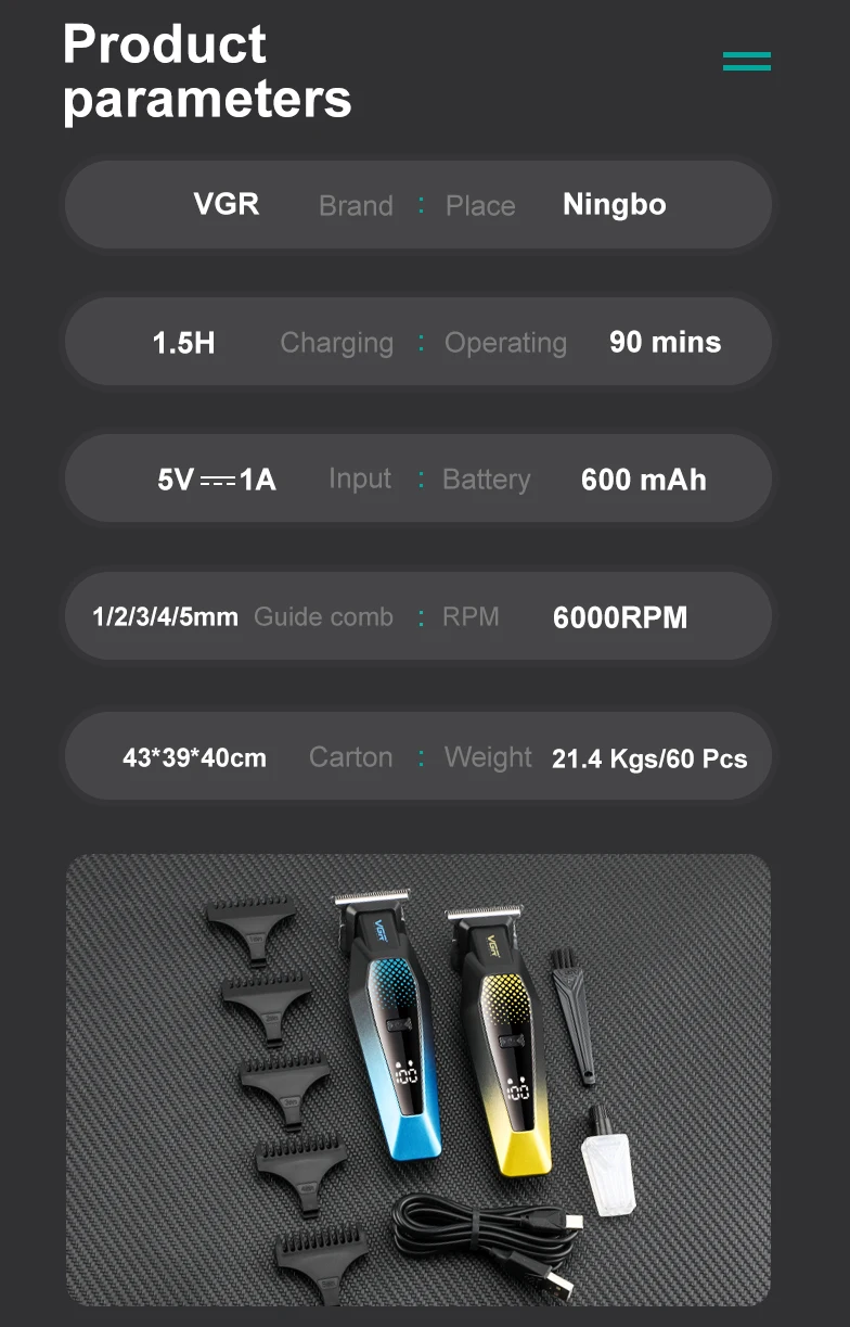 ❤❤❤❤❤هذه هي مجموعة ماكينة تشذيب الشعر الأصلية من العلامة التجارية VGR.إنه يتميز بأداء قوي ومظهر متميز وتصميم آمن وموثوق وتجربة مستخدم مريحة وأداء ممتاز من حيث التكلفة.تتمتع بشعبية عالية وسمعة طيبة في جميع أنحاء العالم.هذا هو VGR 253