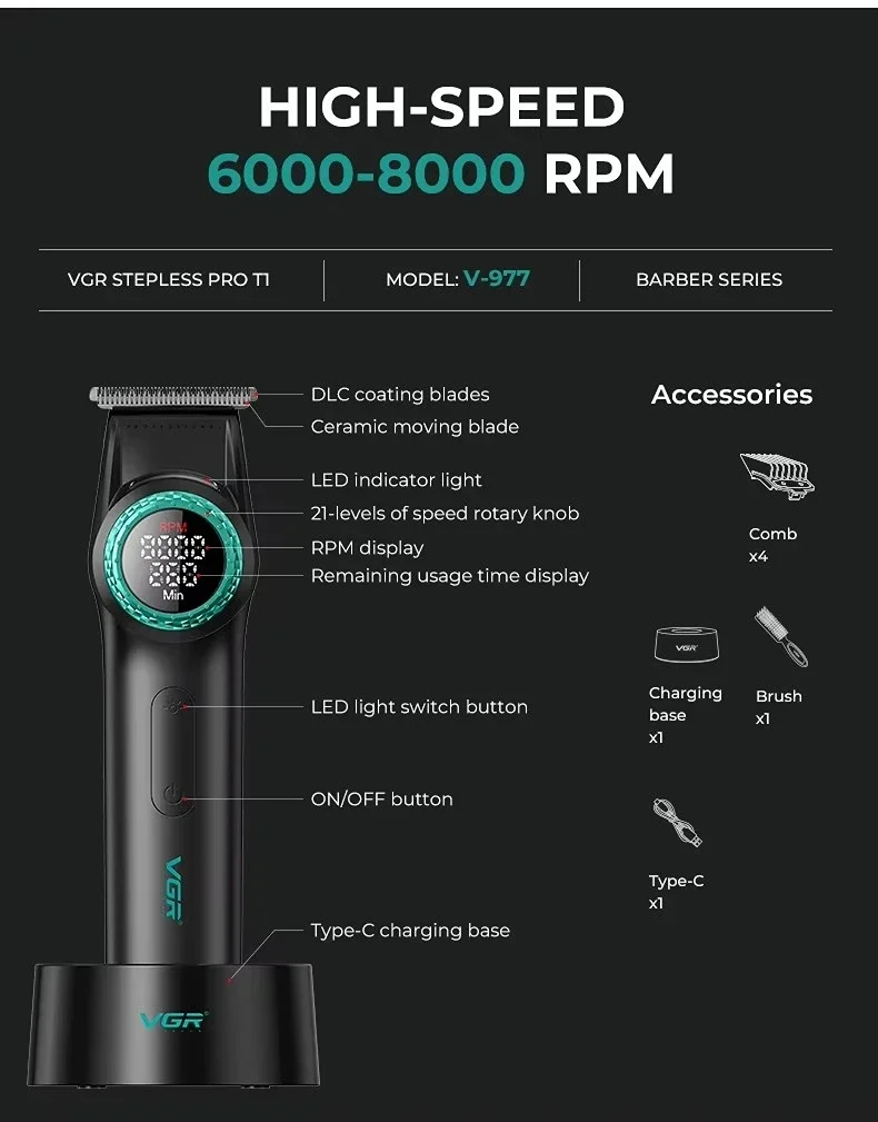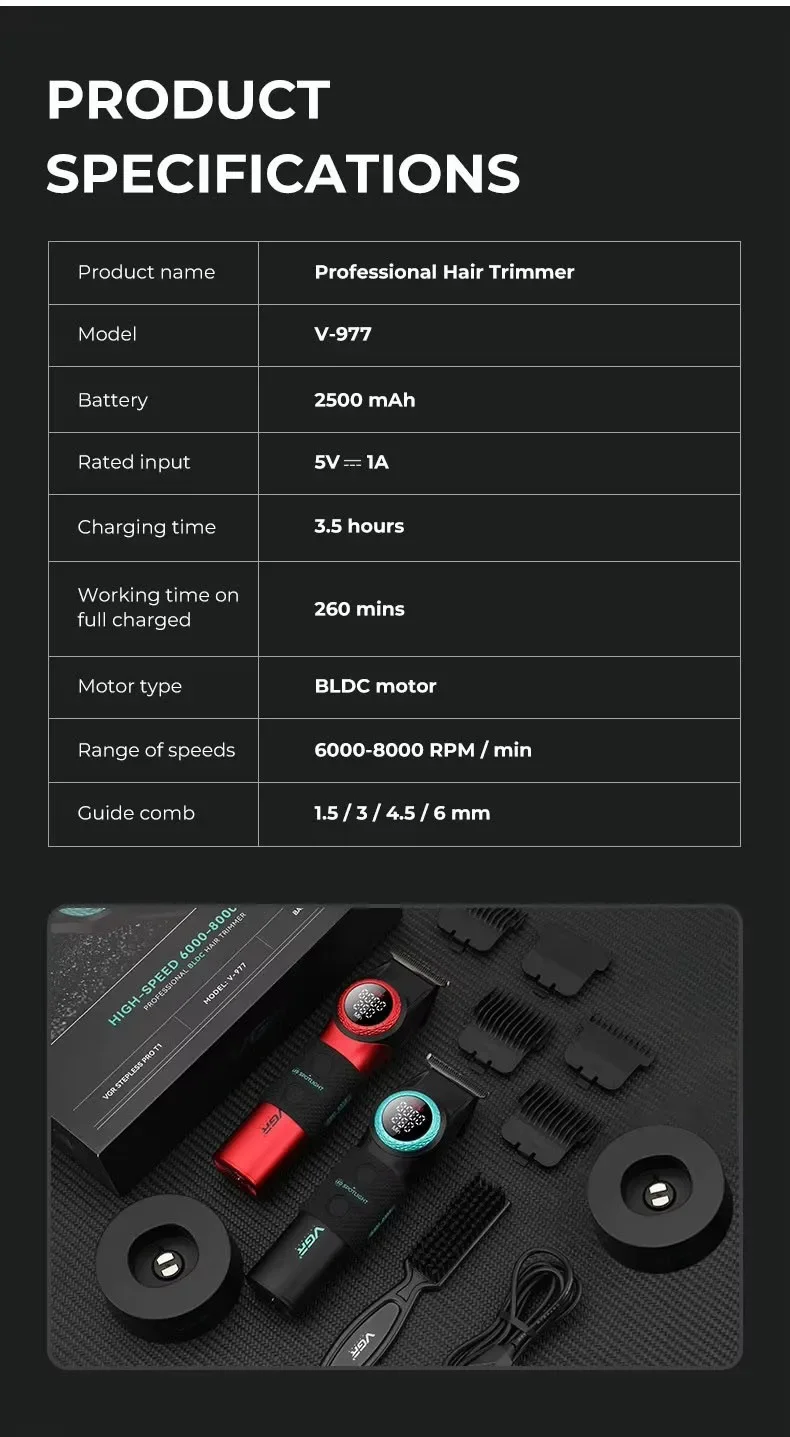★محرك عالي السرعة 8000 دورة في الدقيقة:يتميز V-977 بمحرك قوي يدور بمعدل 8000 دورة مذهلة في الدقيقة (RPM)، مما يضمن قص الشعر بسرعة وكفاءة.