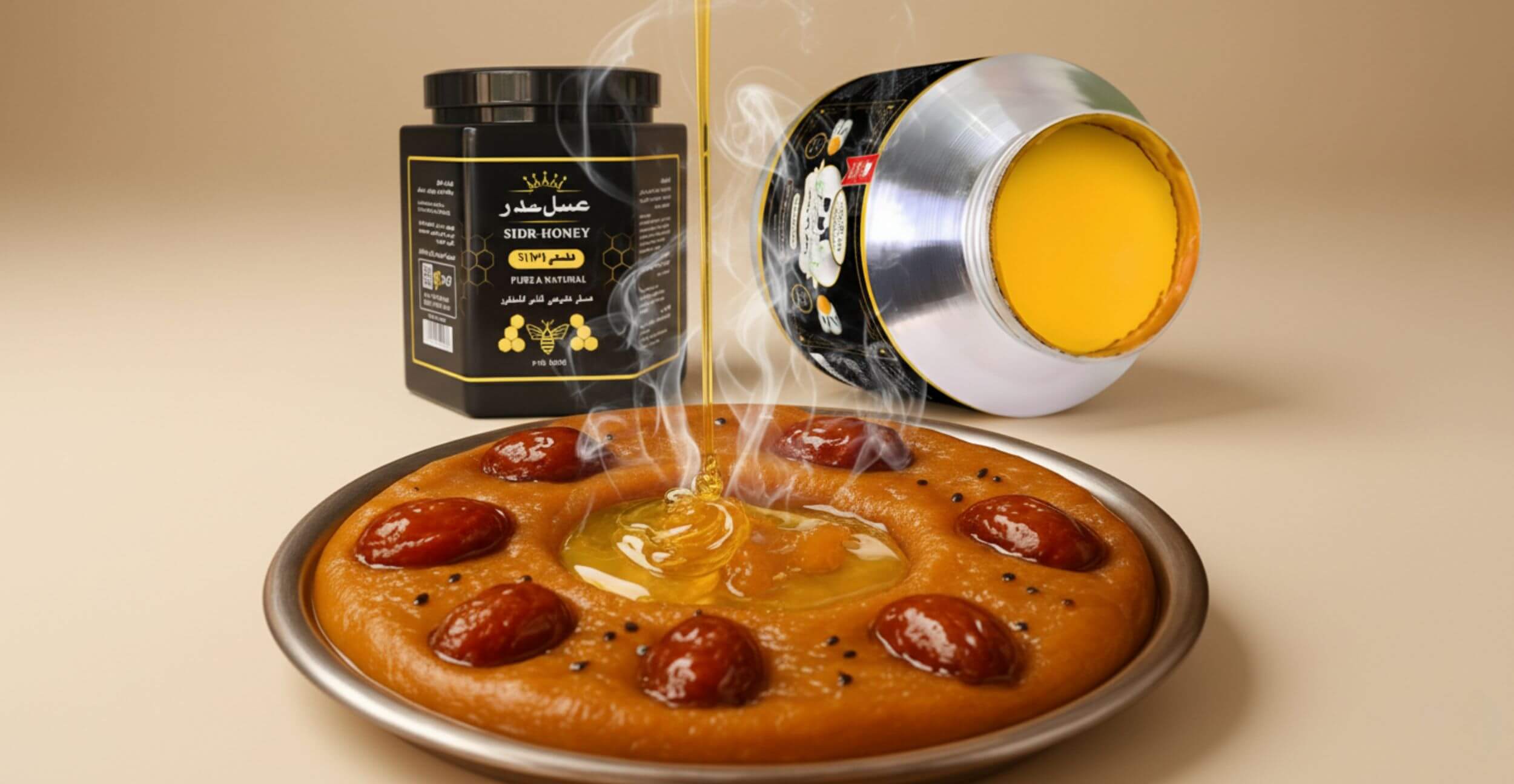 بكج فاخر يحتوي على سمن بقر بلدي نجران 1 كيلو طبيعي 100% وعسل سدر فاخر 0.5 كيلو — توليفة متكاملة تمنح الجسم طاقة طبيعية ومذاقًا يعيد الذكريات القديمة.