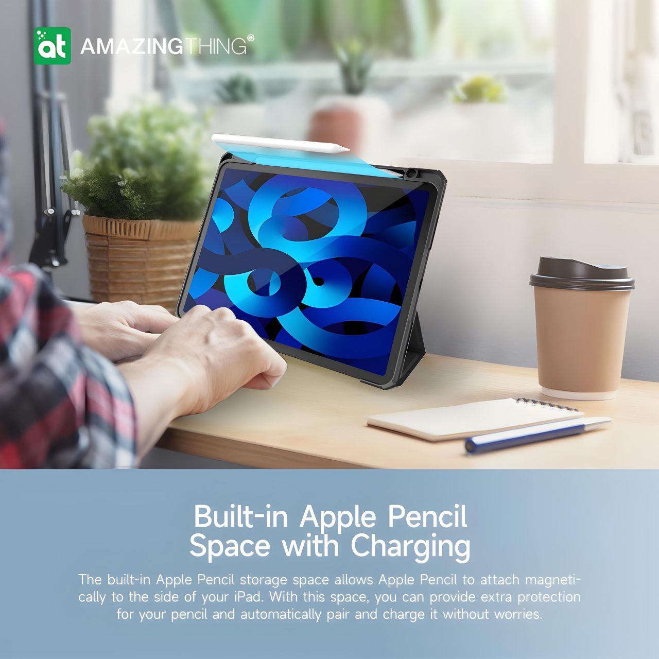 مساحة مدمجة لقلم Apple مع دعم الشحن: يوفر الكفر مساحة مخصصة لقلم Apple مع إمكانية الشحن، مما يضمن حماية القلم أثناء الشحن وحفظه بأمان.