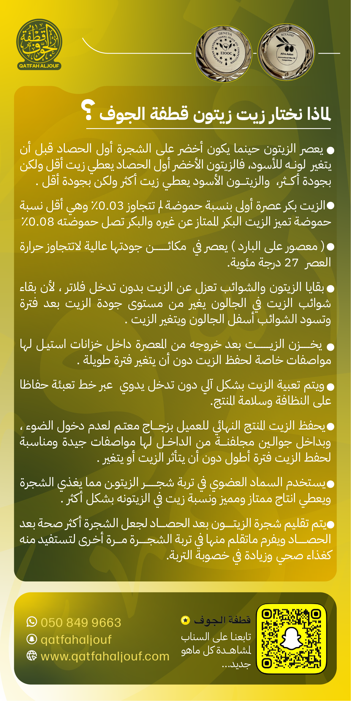 720 ر.سقطفة الجوف الزراعية تقدم لكم أجود المنتجات من مزارعها بالجوف متخصصون بزيت الزيتون البكر والمعصور على البارد وحائز على جوائز عالمية وميداليات في معيار الجودة . سجل تجاري رقم 1010638088