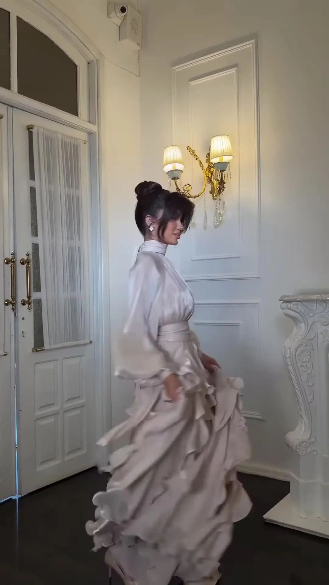 فستان بياقة مدورة وأكمام طويلة وكشكشة لامعة على الطراز العربي بطول الأرض فستان للإجازات فيستدو نسائي