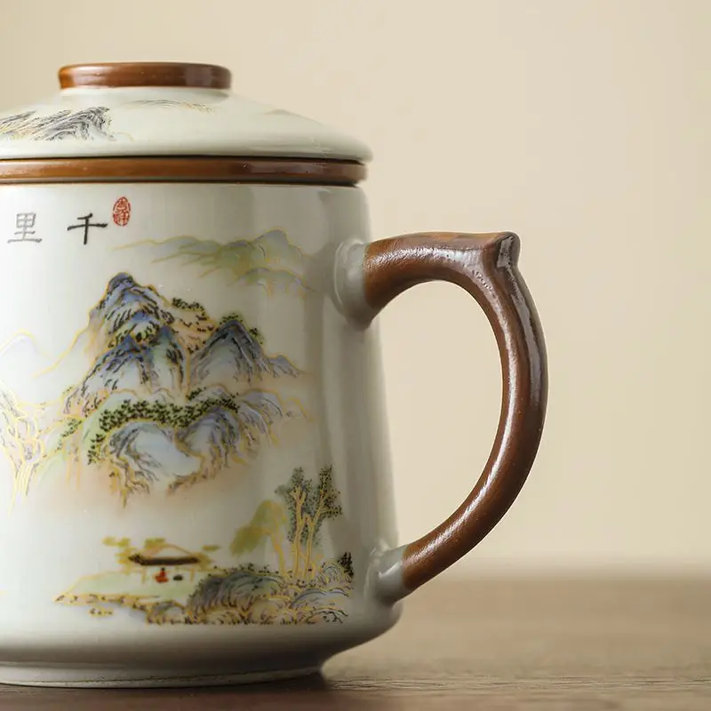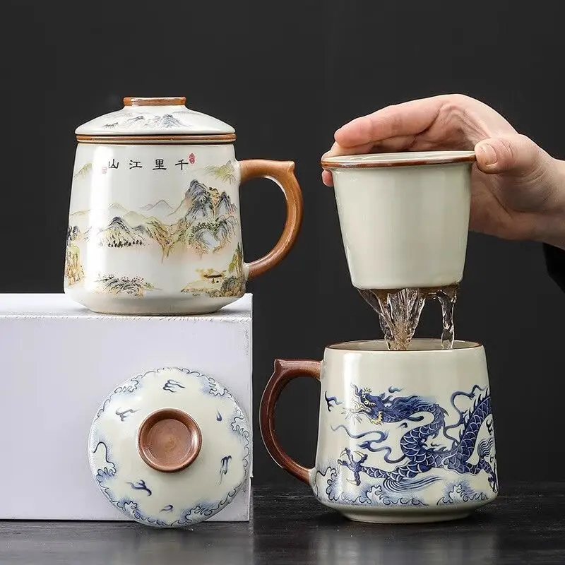 كوب سيراميك من Ru Kiln مع غطاء، كوب فصل الشاي للمنزل، كوب عالي الجودة لصنع الشاي والمكتب، فنجان شاي هدية - التنين الصيني