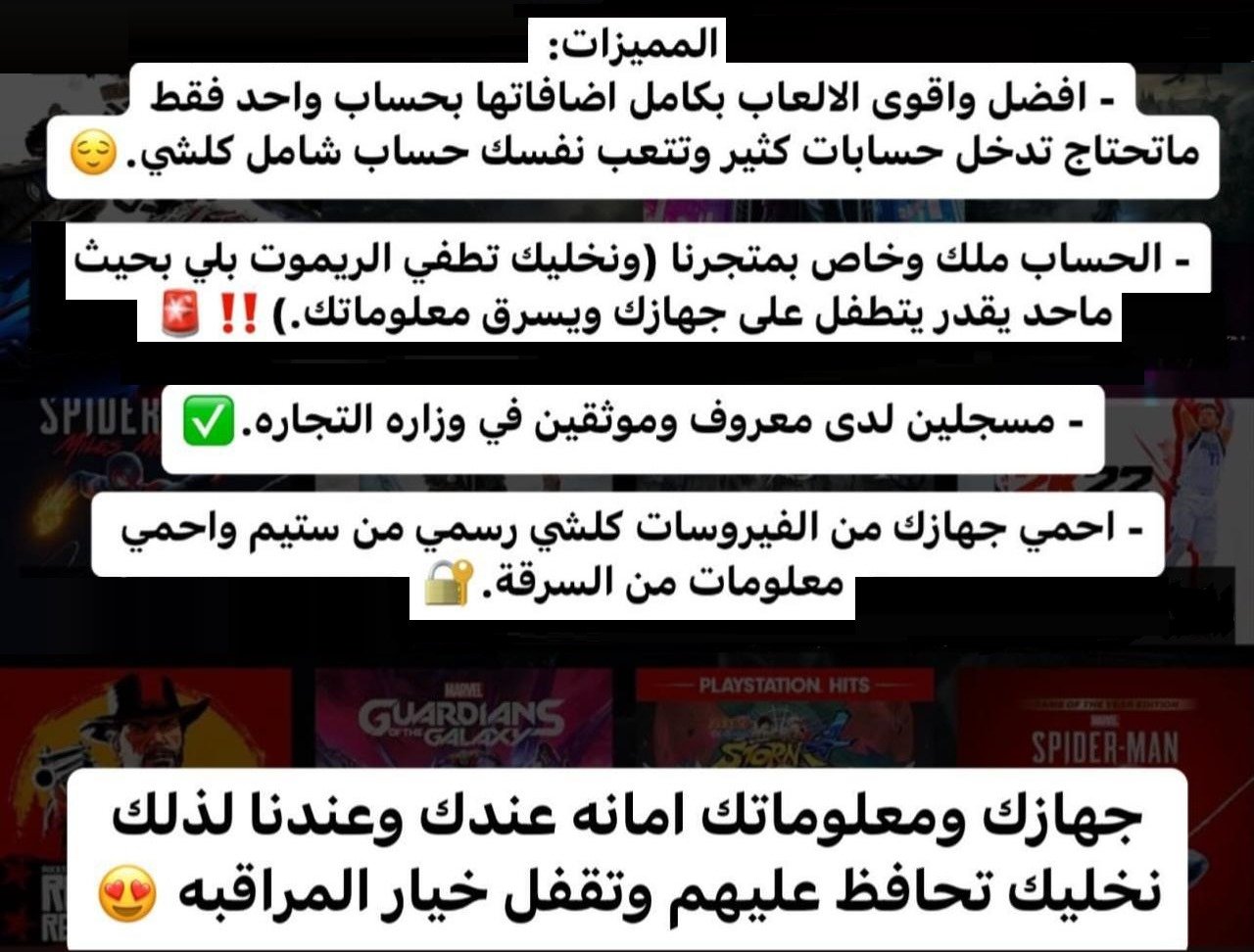 راح نضيف العاب بشكل مستمر ان شاء الله, من اقوى واجدد الالعاب بحيث ماتحتاج تشتري كل لعبه بحساب منفرد وتطلع عليك بمبلغ كبير وتخسر فلوسك, نحن نجمعلك اقوى واجدد الالعاب حتى المستقبليه ان شاء الله لك بحساب واحد وبسعر ممتاز وبهذا يجب وضع ضمان دخول للحساب بحيث الكل يستفيد.