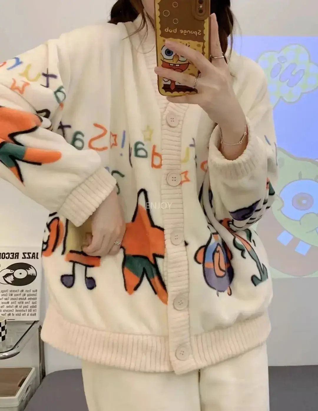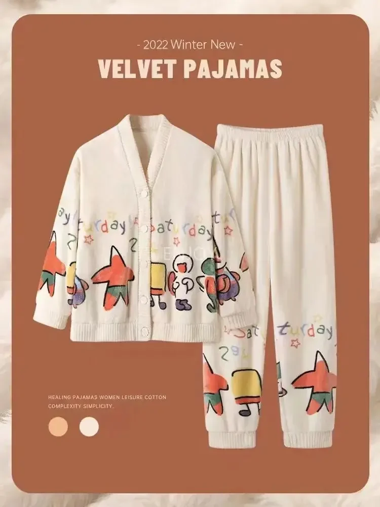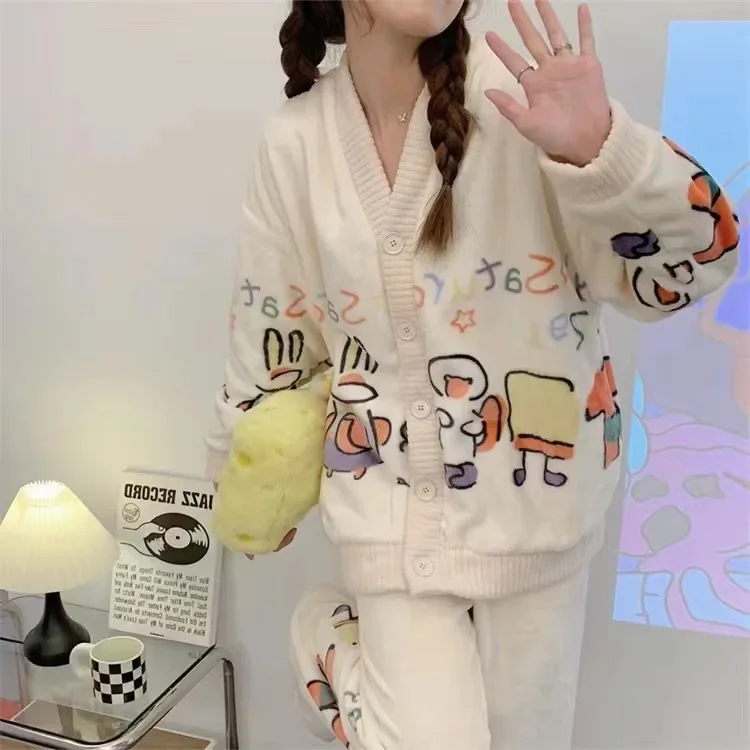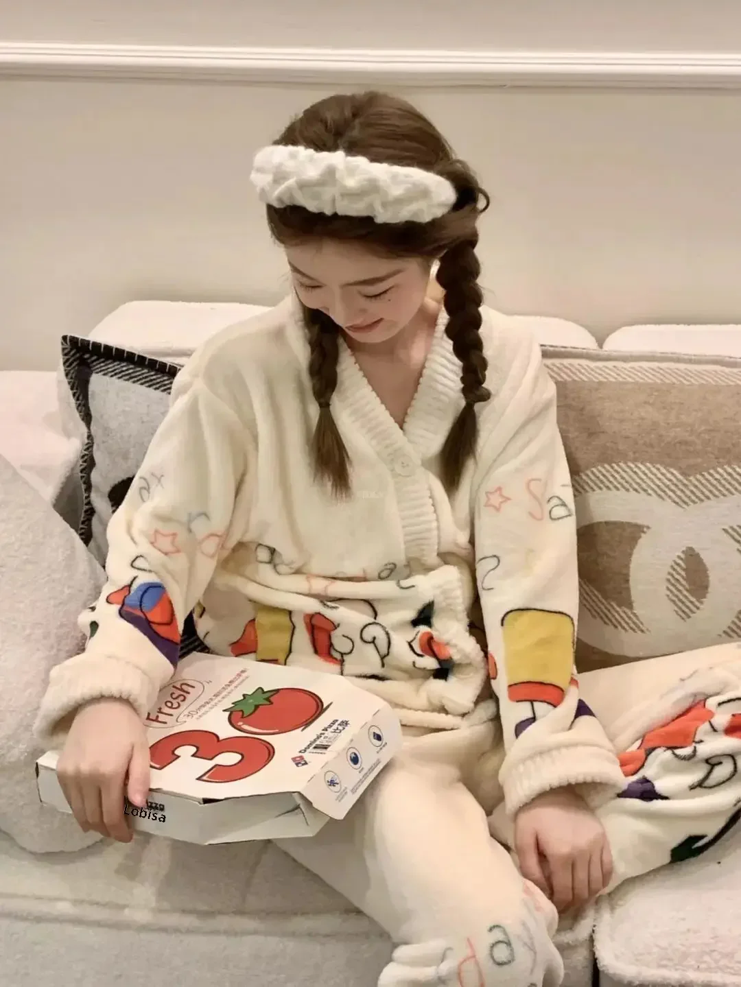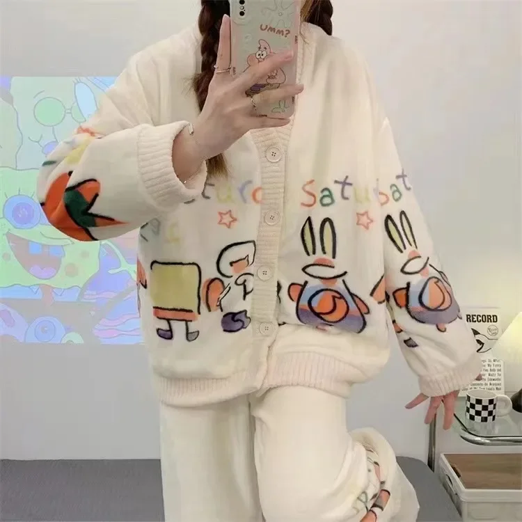 كارديجان نسائي مبطن بالصوف المرجاني ، كارديجان سميك ، كرتون فضفاض ، ملابس نوم دافئة ، رقبة حرف V ، ملابس خارجية ، مرجانية ، شتوية