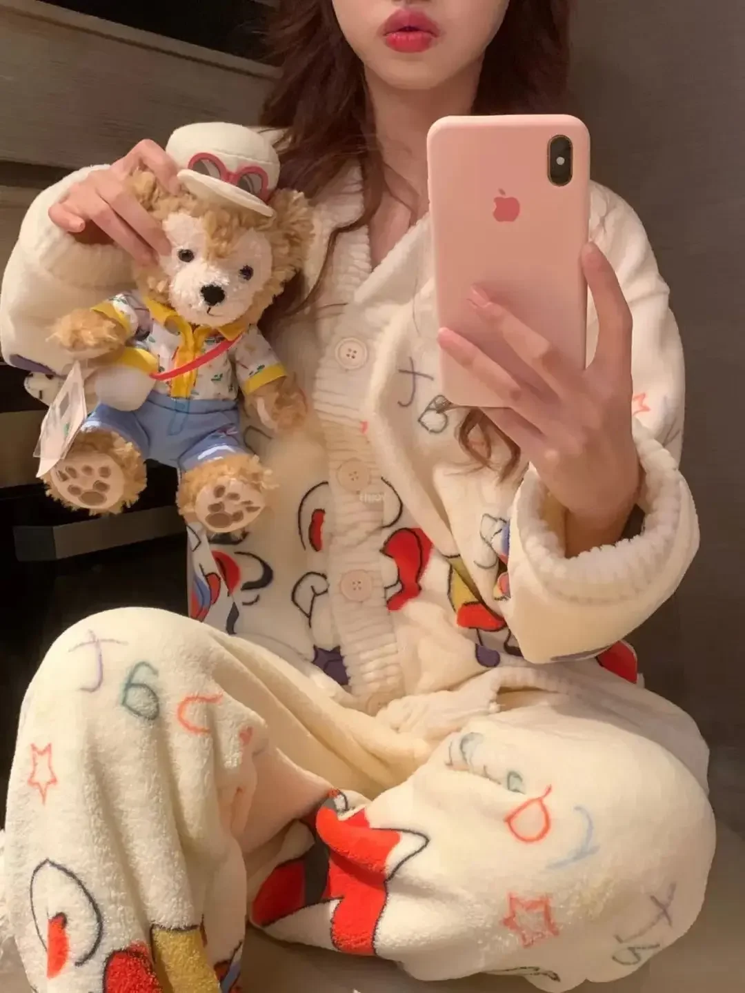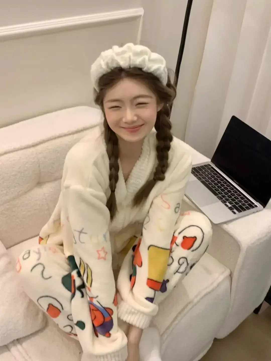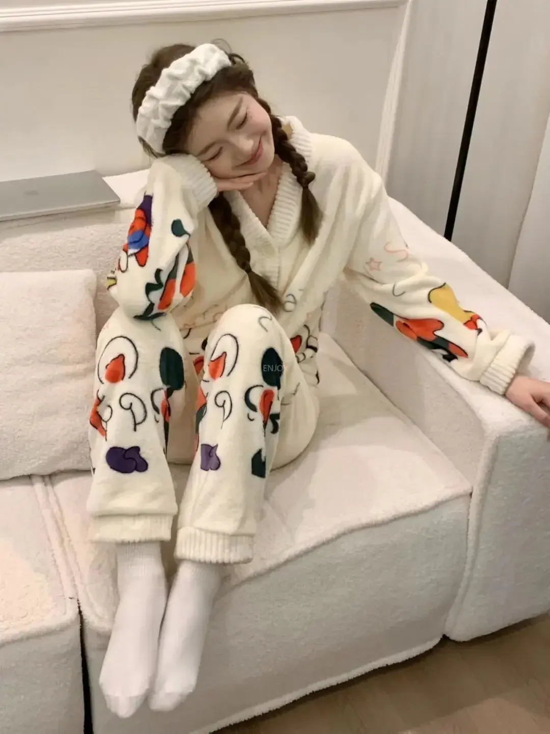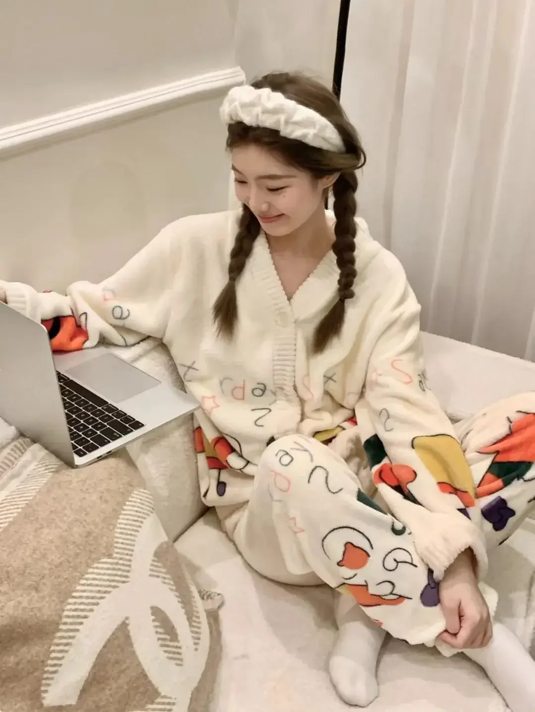 كارديجان نسائي مبطن بالصوف المرجاني ، كارديجان سميك ، كرتون فضفاض ، ملابس نوم دافئة ، رقبة حرف V ، ملابس خارجية ، مرجانية ، شتوية