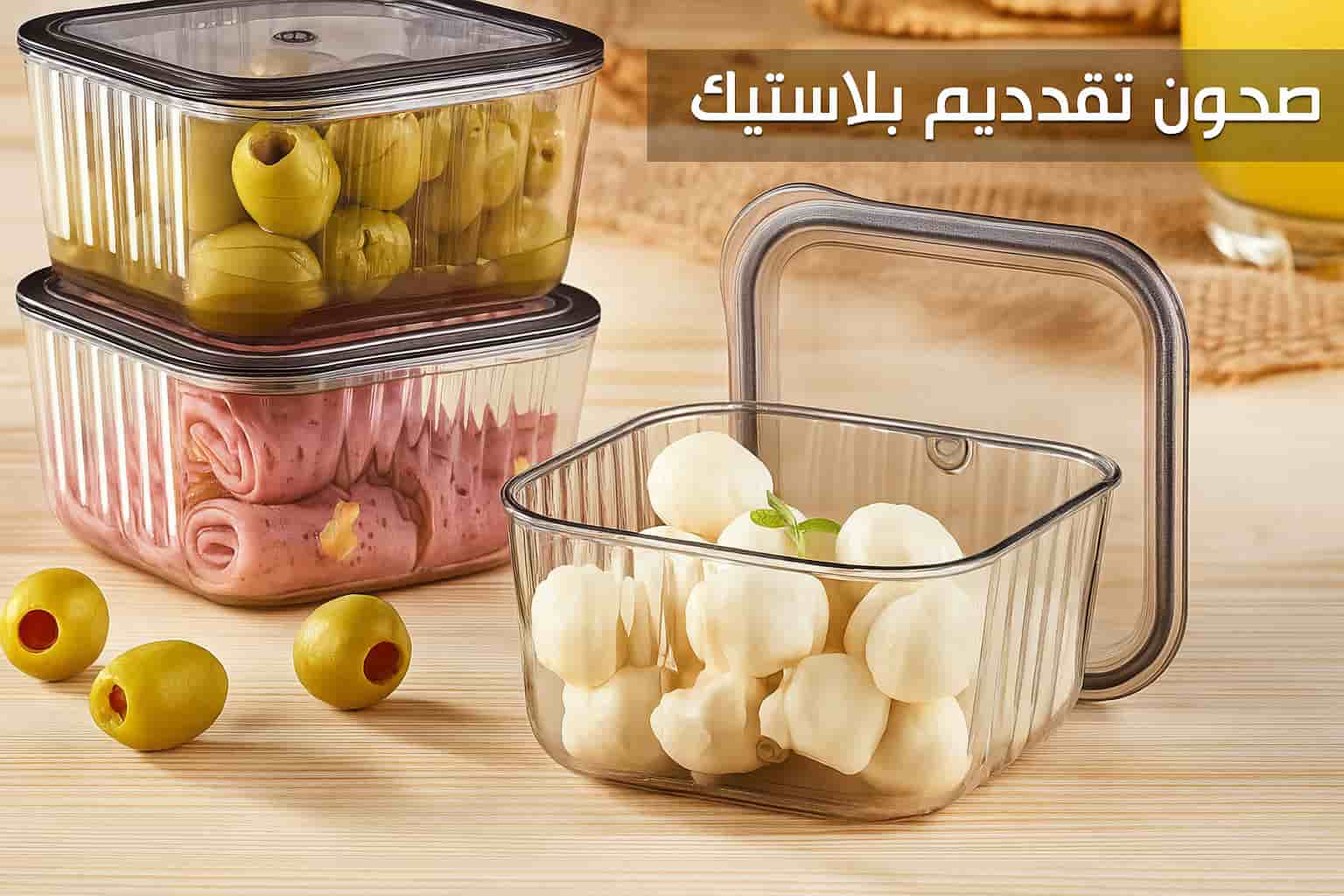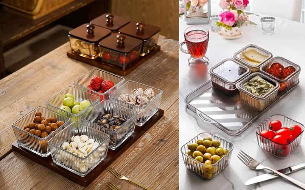 علب تقديم المكسرات بلاستيك شفاف طقم 4 قطع بتصميم انيق مع صحن للتقديم