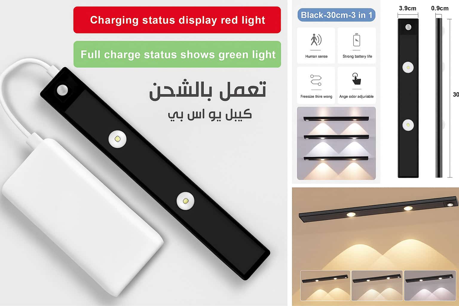 لمبات ليد دولاب حساسات، إضاءة تحت دواليب المطبخ، تعمل بالشحن، طول30 سم مع ريموت كنترول، 3 الوان للإضاءة وسهلة التثبيت بواسطة لاصق