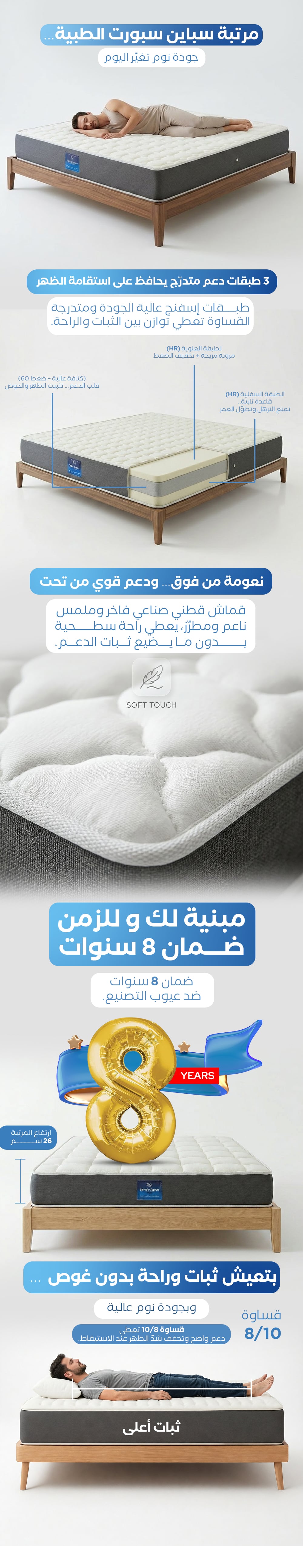 مرتبة سباين سبورت (بدون سبرينج) طبية وخالية من السست و تمنحك الراحه في نومك كما تتحمل كل الاوزان بدون قيود .
