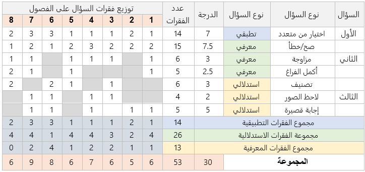 💡 ثلاث اسئلة منوعة بمجموع 54 فقرة على وموزعه بالشكل التالي في الاختبار وعلى الفصول