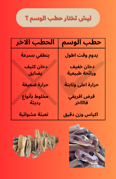 • يُختار الخشب من أشجار يابسة فقط لضمان عدم وجود رطوبة ويعطي وقوة الاحتراق.