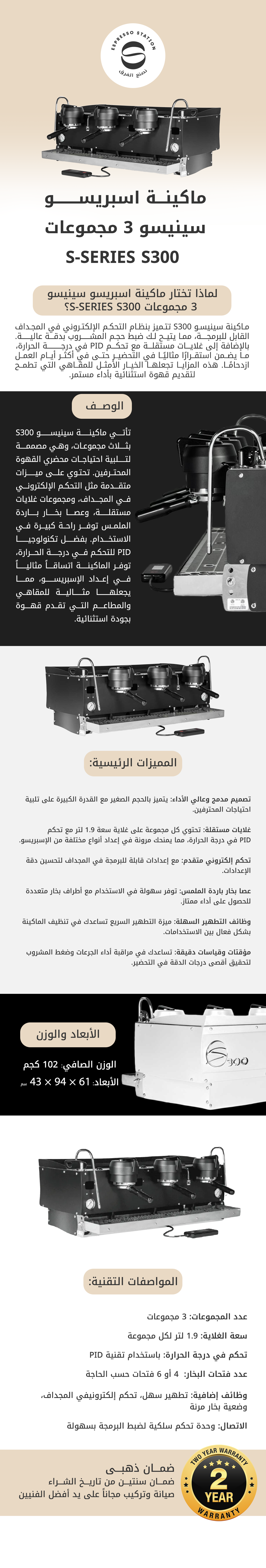 تحتوي ماكينة اسبريسو S300 على الكثير من القوة والاتساق في إطاره الصغير، ويحمل بشكل طبيعي سمعة Synesso فيما يتعلق باستقرار درجة الحرارة والموثوقية. تستخدم كل مجموعة أداة تحكم إلكترونية في المجداف مع إعدادين حجميين قابلين للبرمجة - يتم تشغيلهما عن طريق تحريك المجداف إلى اليسار أو اليمين. تتوفر أيضًا وظيفة التطهير باستخدام زر نمط الممرات الموجود على اللوحة خلف رأس المجموعة مباشرة، حتى تتمكن من مسح المجموعة بسرعة وشطف مرشح القهوة الخاص بك. تحتوي كل مجموعة على غلاية مستقلة سعة 1.9 لتر مع التحكم في درجة الحرارة PID، مما يوفر المزيد من المرونة للمحلات التجارية التي تقدم أنواع مختلفة تمامًا من قهوة الإسبريسو. لمزيد من ثبات درجة الحرارة، يتم تسخين الماء مسبقًا في أنابيب التبادل الحراري داخل غلاية البخار قبل التوجه إلى غلايات المشروب، لذلك يمكنك الاعتماد على بقاء ماء المشروب في درجة حرارة حتى في أكثر الأيام ازدحامًا.