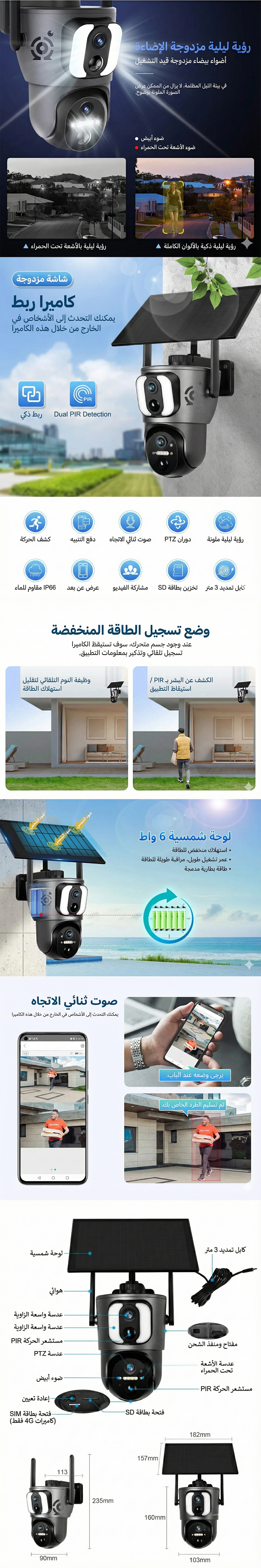 كاميرا طاقة شمسية اصدار S21 بدقة 6 ميقا بكسل بعدستين ثابتة و متحركة: هذه الكاميرا تأتي مع عدسة واسعة ثابتة وعدسة متحركة تعمل على شريحة بيانات إنترنت وتدعم شركات الاتصالات مثل STC وليبرا وزين. تتميز بتقريب بصري حقيقي وتتبع الحركة للإشخاص بالإضافة إلى رؤية ليلية واضحة
