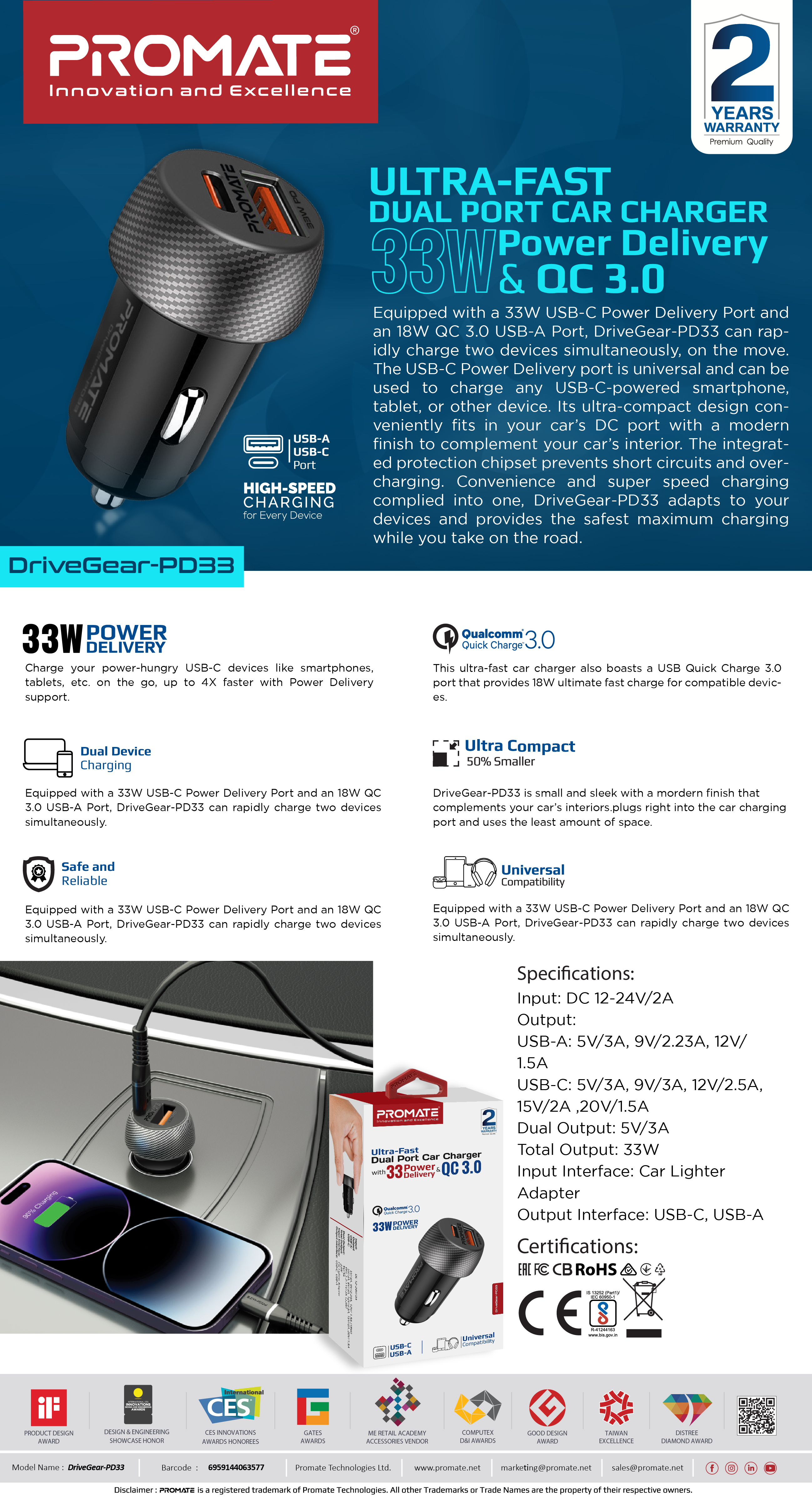 إذا كنت بحاجة إلى شاحن سيارة سريع يضمن لك شحنًا فعالًا أثناء التنقل، فإن Promate DriveGear-PD33 هو الخيار المثالي. يتميز بمنفذ USB-C™ بقوة 33 واط ومنفذ USB-A QC 3.0 بقوة 18 واط، مما يسمح لك بشحن جهازين في نفس الوقت بسرعة وكفاءة. تصميمه المدمج يجعله مناسبًا لأي سيارة، كما توفر أنظمة الحماية الذكية أمانًا إضافيًا ضد الشحن الزائد والماس الكهربائي.