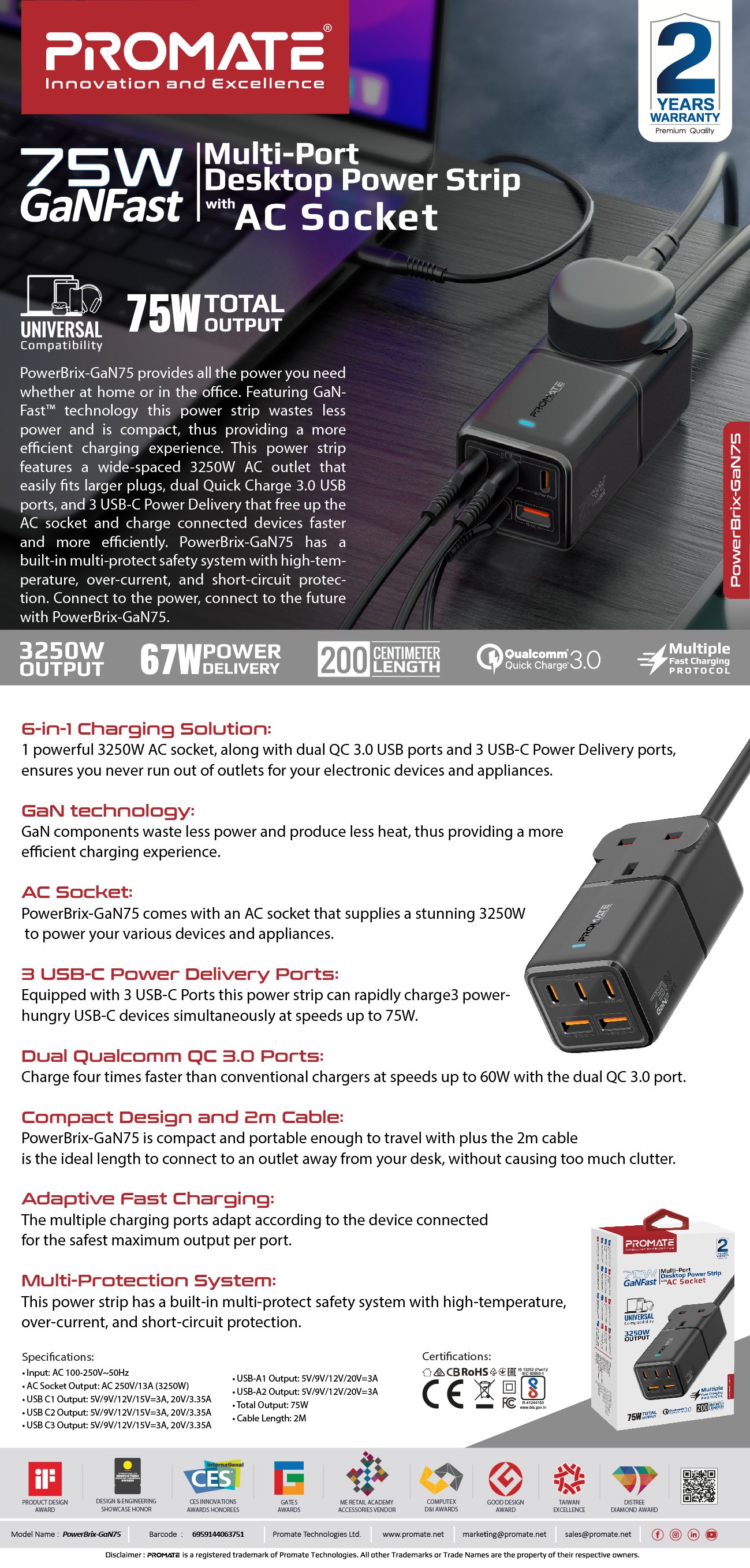 مشترك طاقة GaNFast متعدد المنافذ بقوة 75 واط - PowerBrix-GaN75