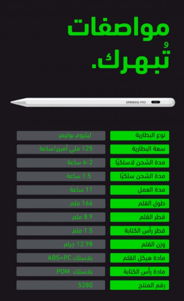 یمكن استخدام EPencil Pro لمدة تصل حتى 11 ساعة متواصلة بشحن كامل، مع إمكانیة شحنه لاسلكیا وسلكيا.