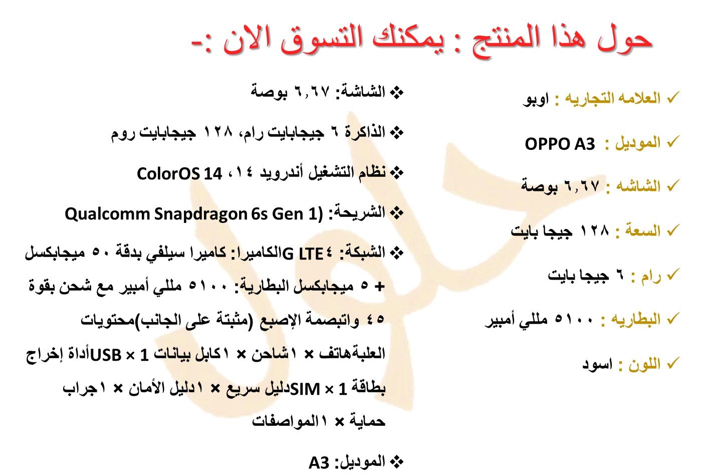 هاتف اوبو اي 3 رام 6 جيجا ذاكرة تخزين 128 جيجا - لون اسود