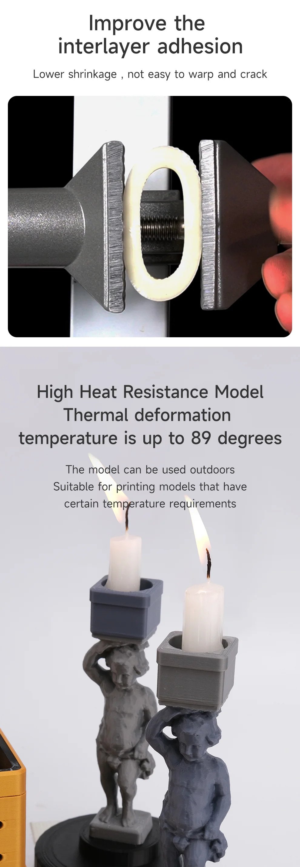 🔹 انخفاض نسبة الانكماش: يُظهر انكماشًا ضئيلًا أثناء الطباعة، مما يقلل من خطر التشوه والتشقق. 📐