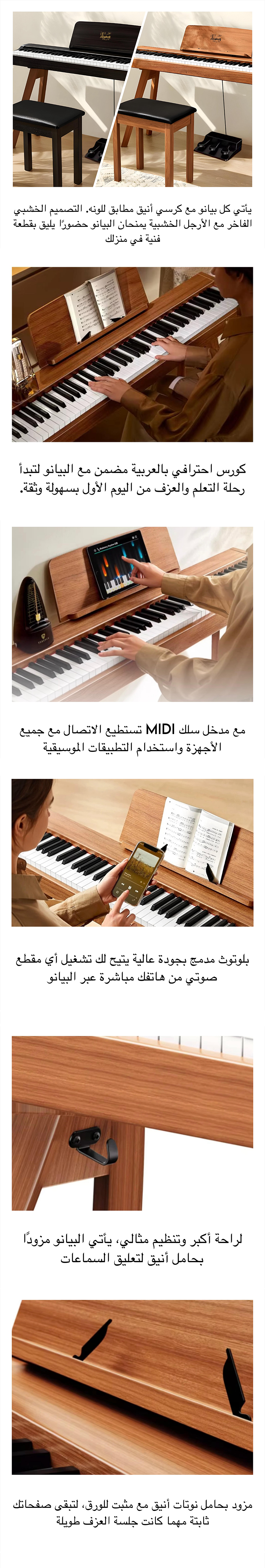 • كورس احترافي بالعربية مضمن مع البيانو لتبدأ رحلة التعلم والعزف من اليوم الأول بسهولة وثقة.