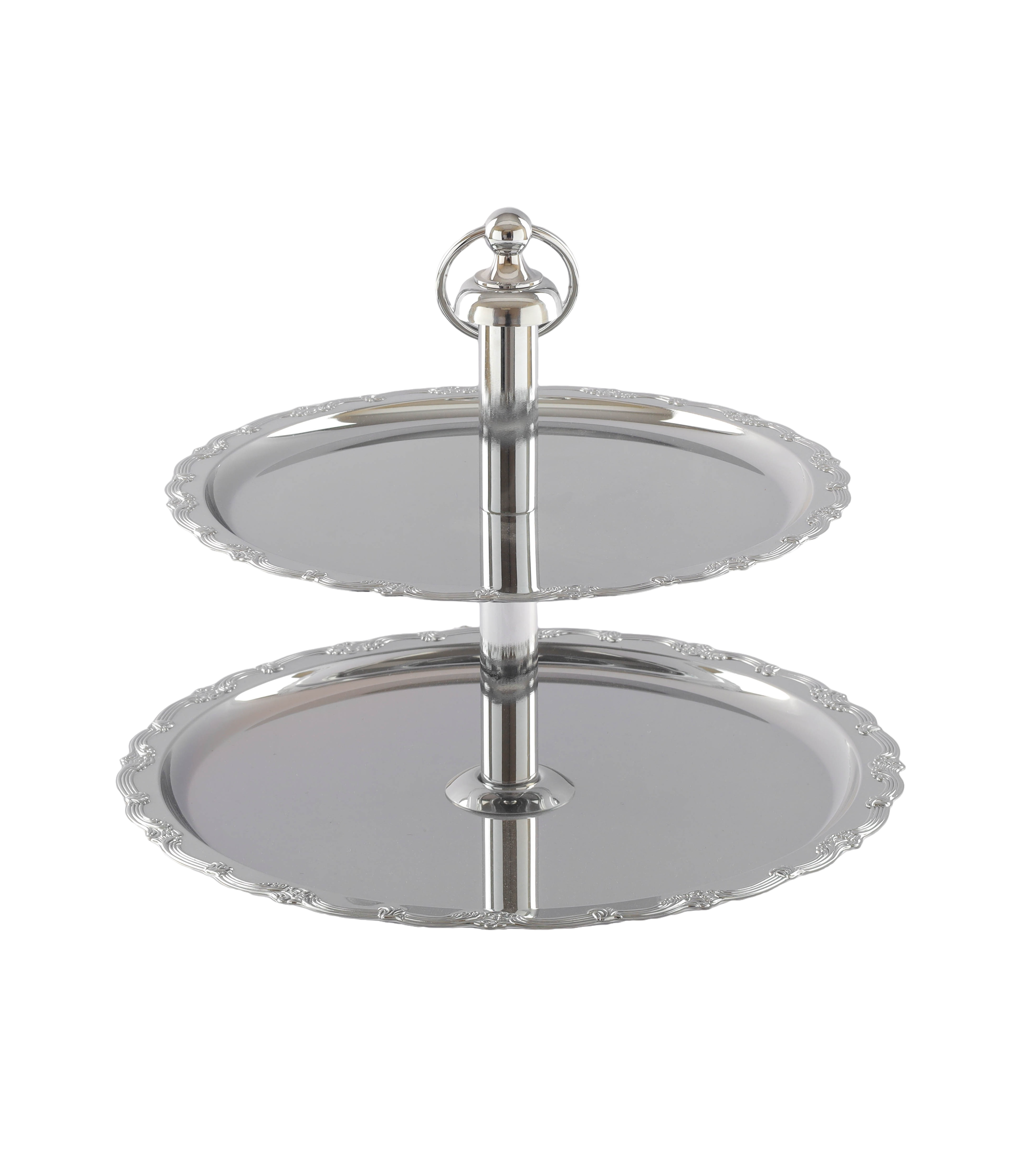استاند فواكه دورين دائري فضي بنقشة كلاسيكية قطعة فنية أنيقة وعملية لتنظيم الفواكه بشكل جذاب مصنوع من مواد عالية الجودة تصميم كلاسيكي يضفي لمسة من الفخامة على مائدتك مثالي للاستخدام اليومي وللمناسبات الخاصة.