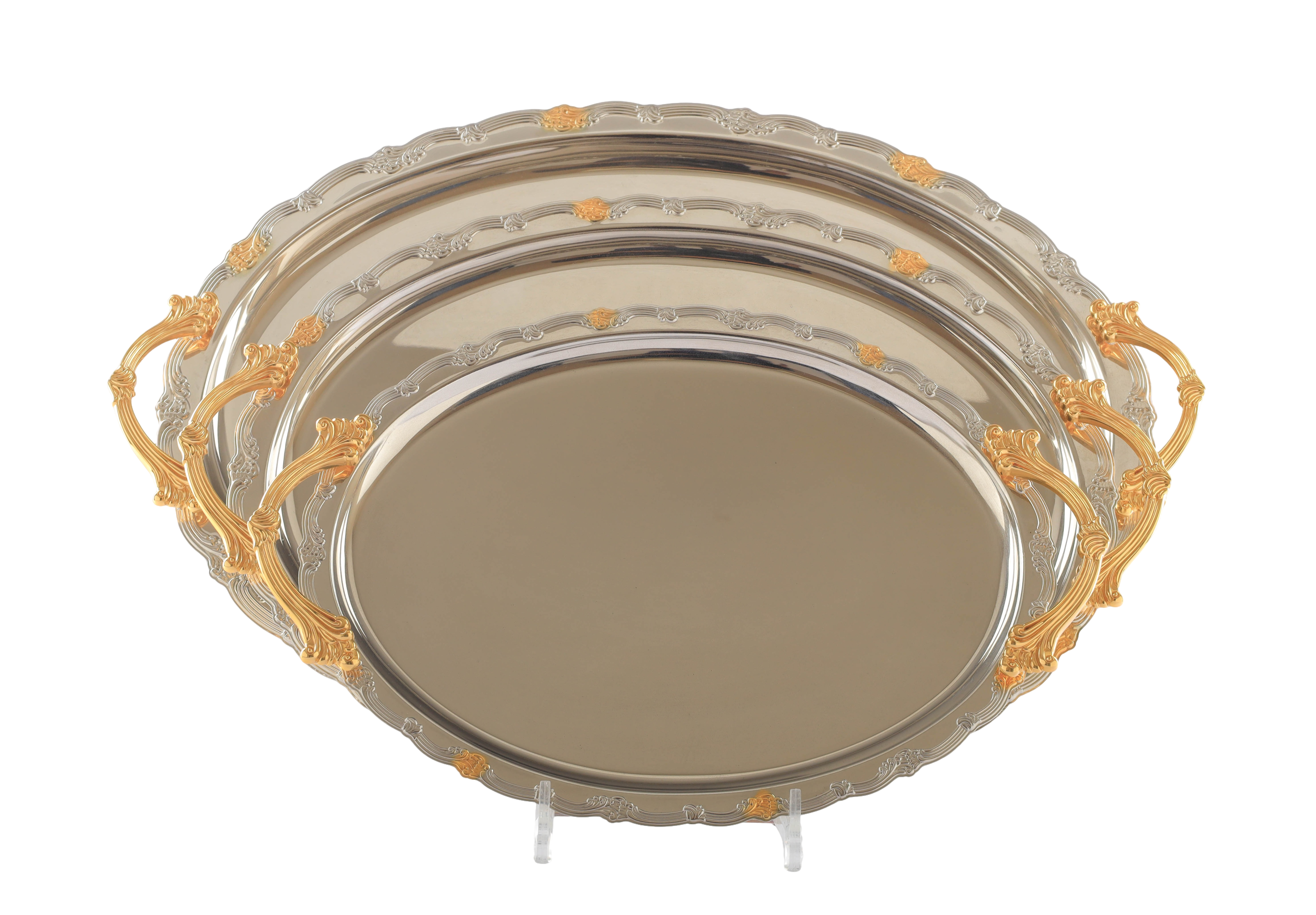 طقم تباسي سادة من النيكل الأصيل مصمم ليضفي فخامة على مائدتك يتميز بمقابض ذهبية أنيقة وتطريز دقيق مما يجعله تحفة فنية متوفر بثلاثة أحجام لتلبية مختلف احتياجاتك.