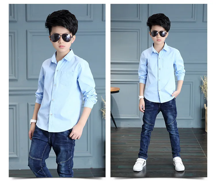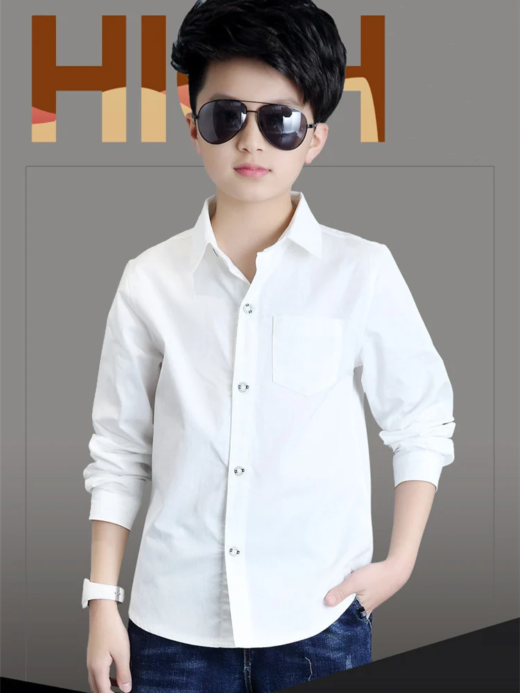 ملابس أطفال ربيع 2021 كم طويل بنين قمصان موضة القطن الصلبة الأبيض قميص الأطفال بدوره إلى أسفل طوق زر بلايز 8 12y