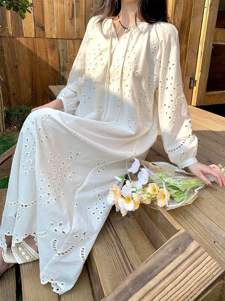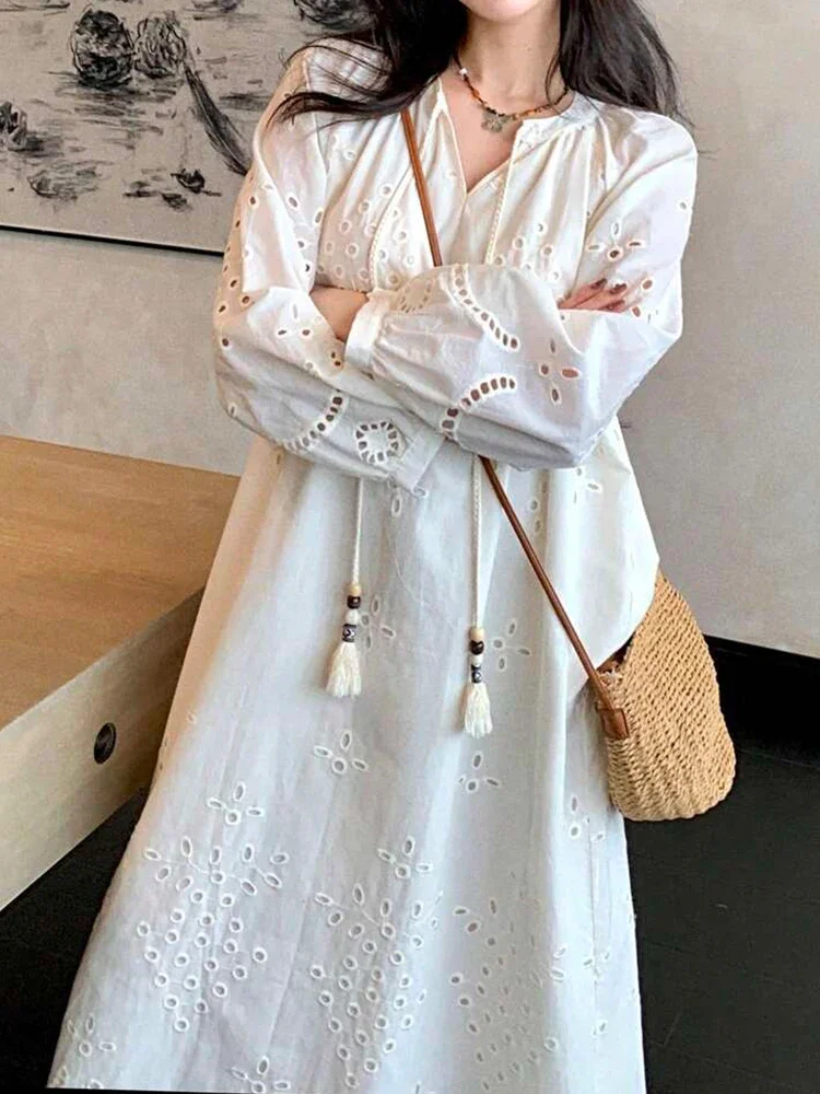 فستان نسائي من Rafiah Boutique بأكمام طويلة وطية صدر السترة مفرغ لفستان صيفي طويل مع أزياء أنيقة بلون متواضع