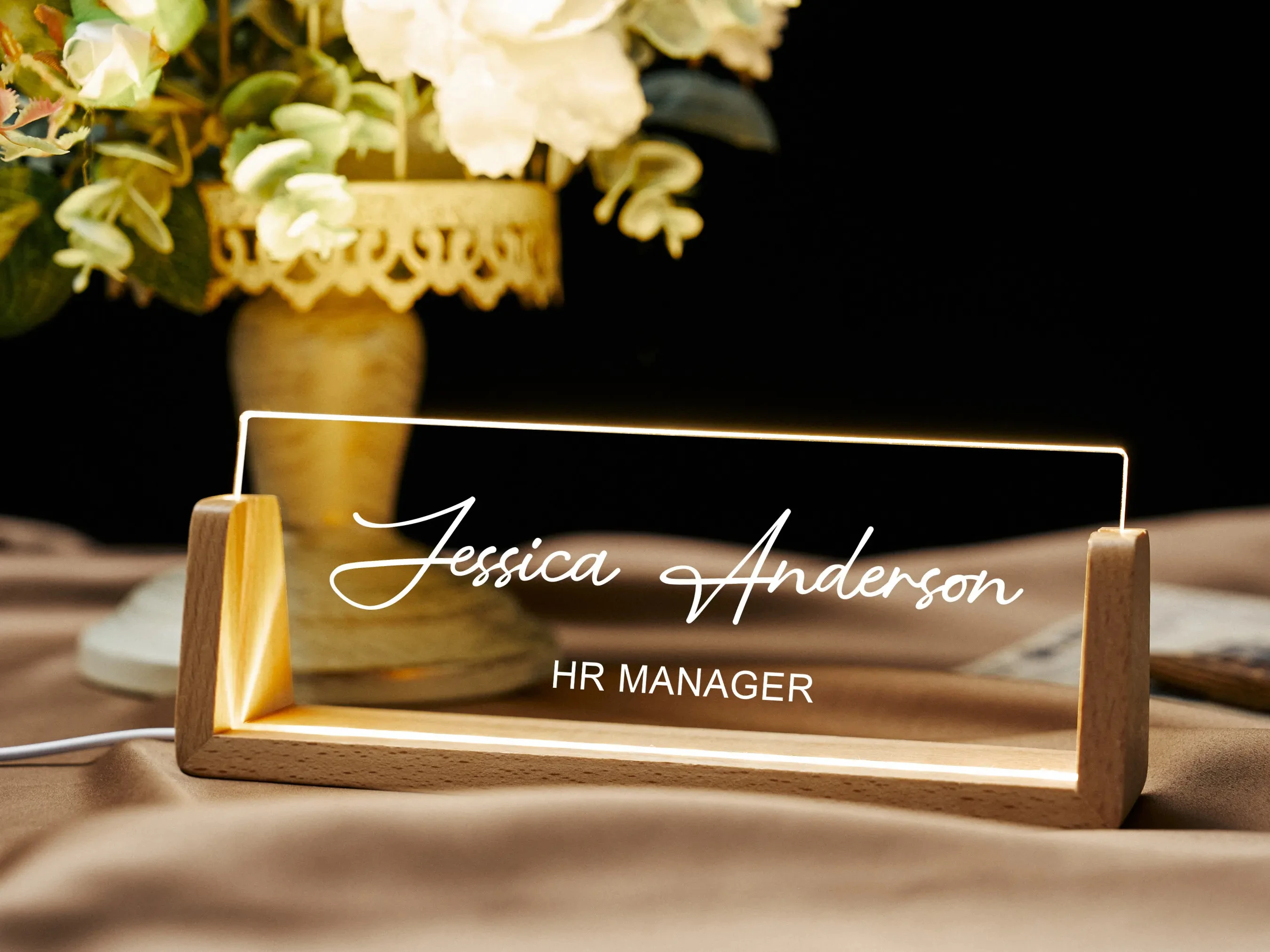 لوحة اسم مكتب مخصصة مع قاعدة LED، علامة اسم أكريليك مضاءة، فكرة ملحقات مكتب المكتب، هدايا للرئيس لزملاء العمل