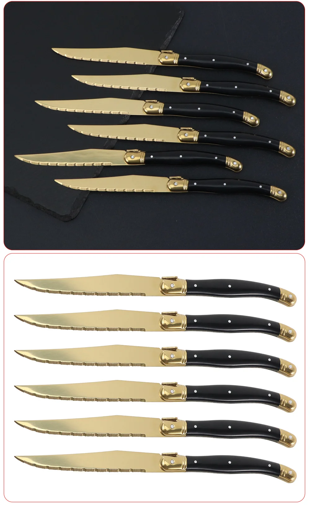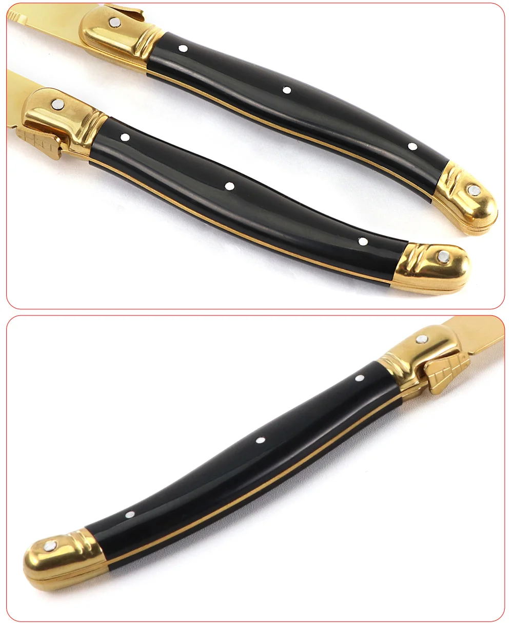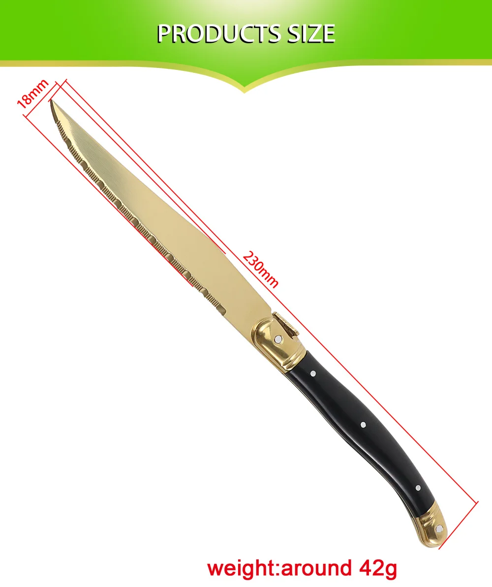 1. عالية الجودة لامعة البولندية والتيتانيوم طلاء الذهب. مجموعة سكين ستيك مصقول بعناية باليد ، لامعة وحادة لقطع شريحة لحم. طلاء الذهب التيتانيوم يجعل سكين شريحة لحم تبدو جميلة وليس من السهل أن سكراث.