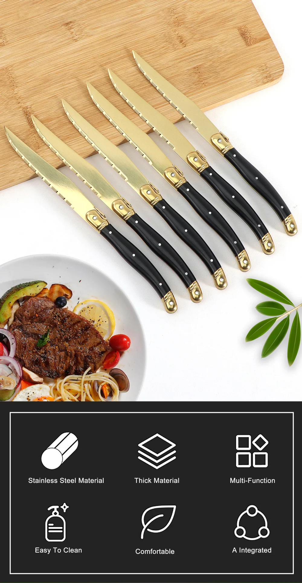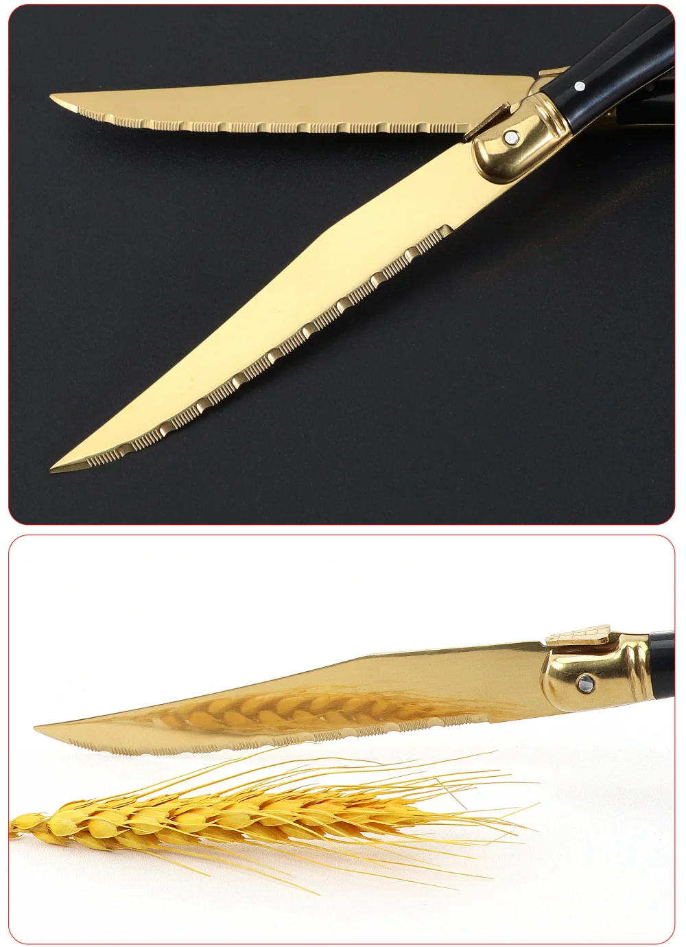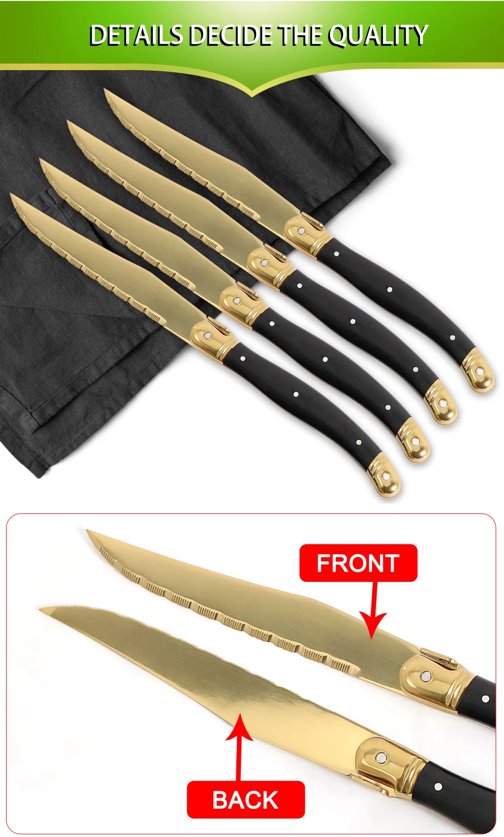 1. عالية الجودة لامعة البولندية والتيتانيوم طلاء الذهب. مجموعة سكين ستيك مصقول بعناية باليد ، لامعة وحادة لقطع شريحة لحم. طلاء الذهب التيتانيوم يجعل سكين شريحة لحم تبدو جميلة وليس من السهل أن سكراث.
