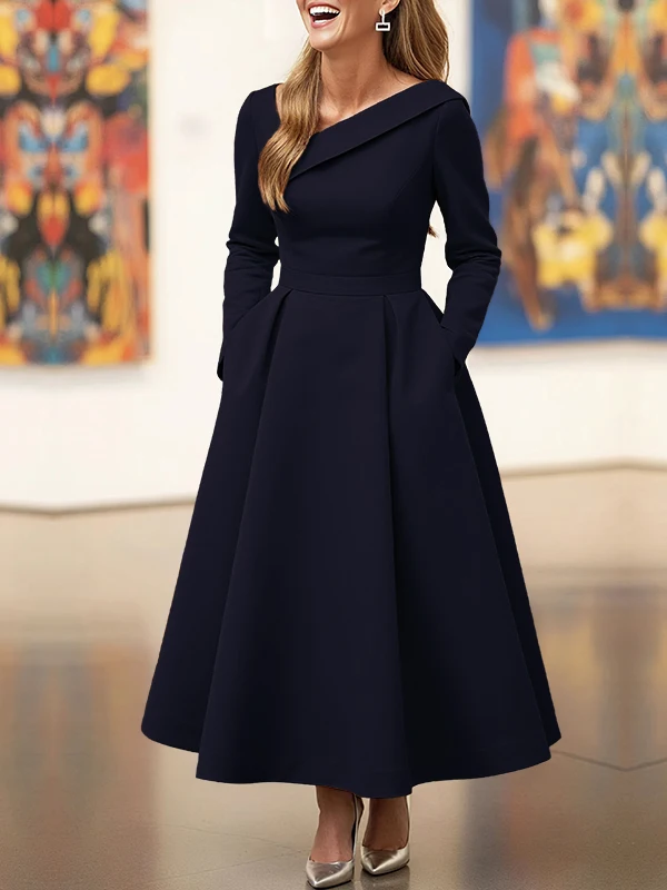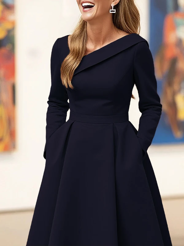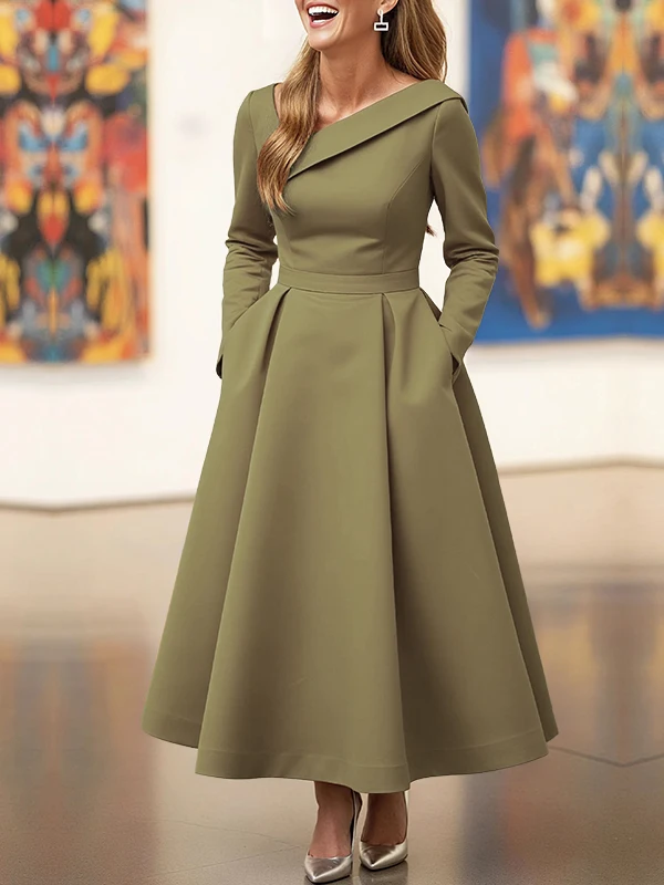 فستان متوسط الطول بياقة غير متماثلة باللون الأخضر الزيتوني وأكمام طويلة أنيق على شكل حرف a لحفلات الزفاف مع جيوب ملابس رسمية لمناسبات الزفاف