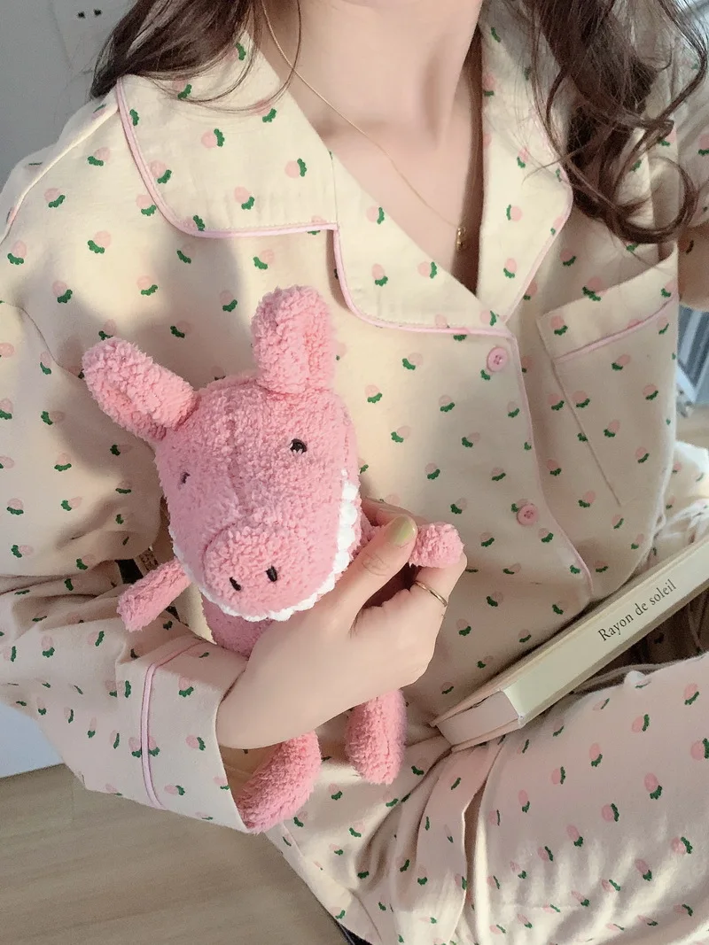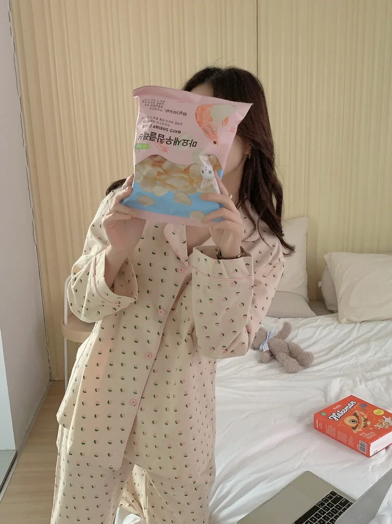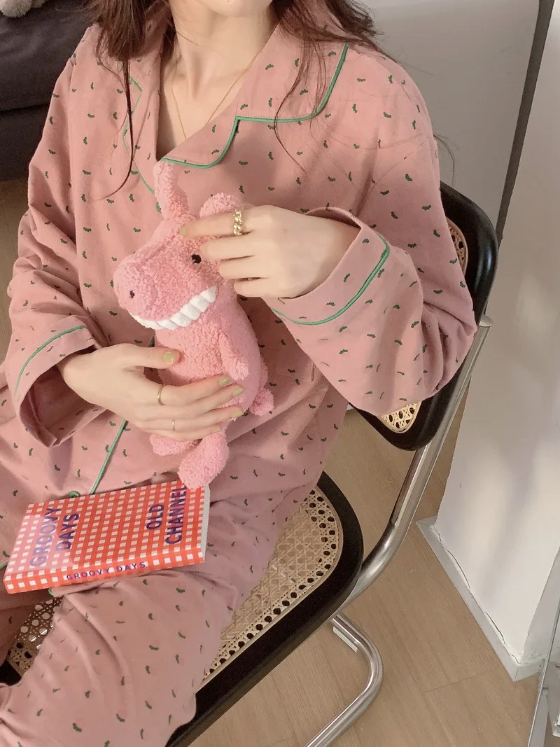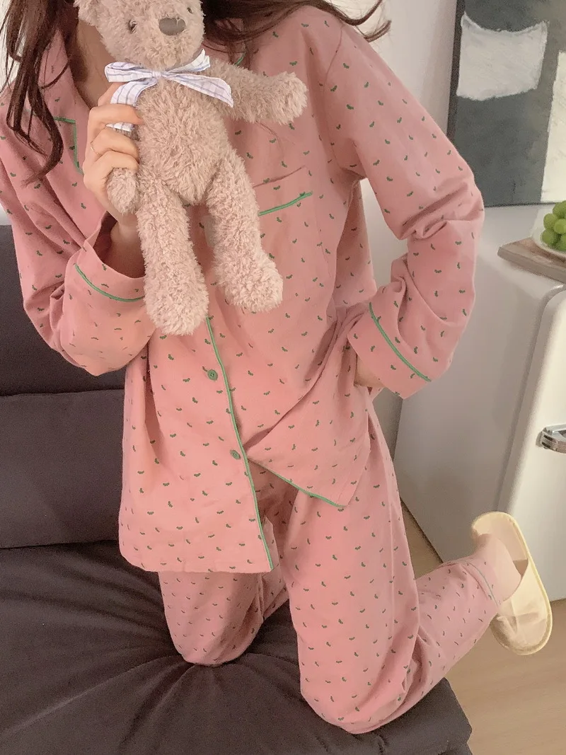 طقم بيجامات كورية نسائية بأكمام طويلة ، بدلة من الكارتون ، طبعة قلب ، الصيف ، أنثى ، ملابس نوم ، الصيف ، لطيف ،